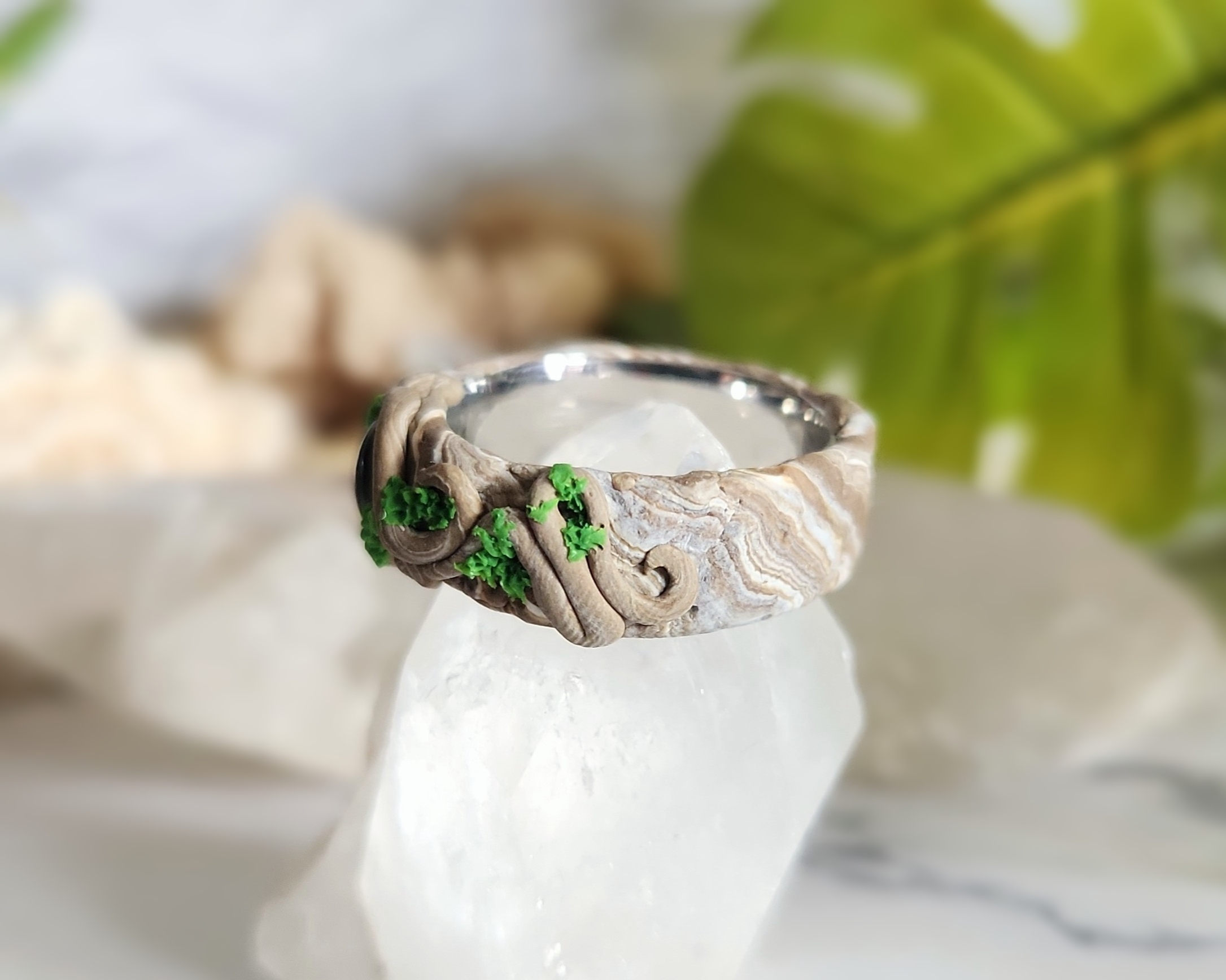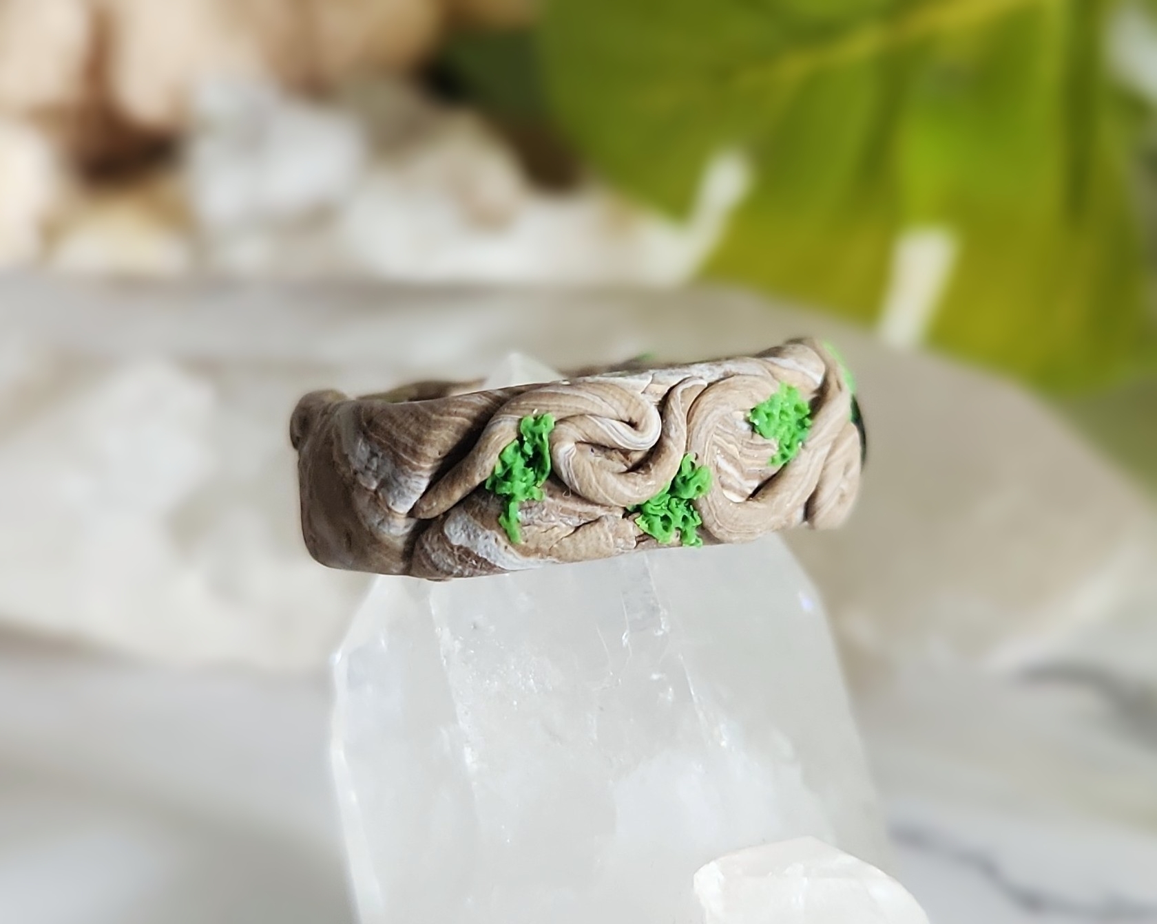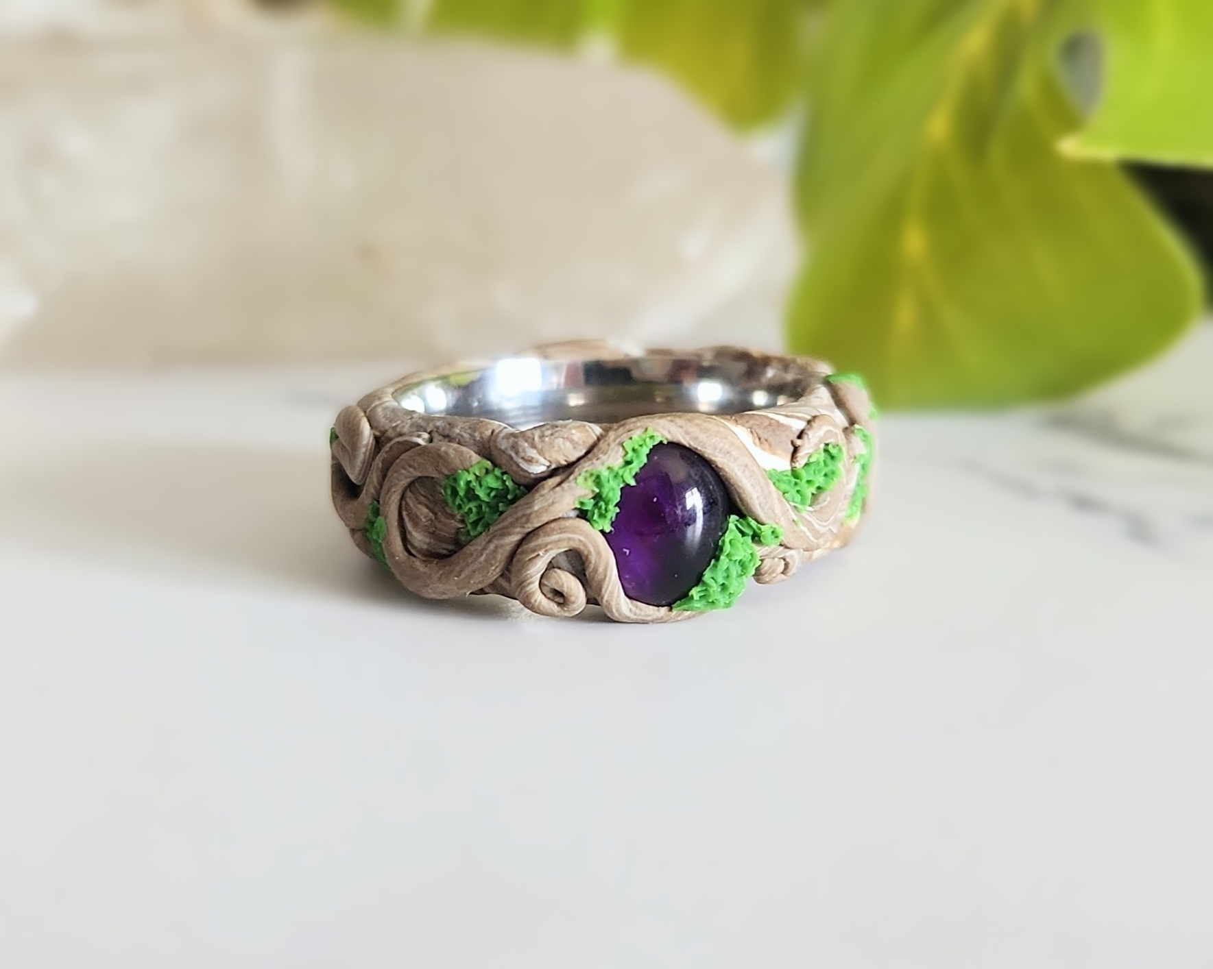 This ring feels like something straight out of a woodland dream. Built on a sturdy Stainless Steel base, it’s been sculpted from Polymer Clay to resemble twisting roots and branches, with tiny pops of green “moss” that bring it to life. At its heart sits a beautifully deep Amethyst gemstone- its royal purple hue catching the light like a hidden gem found in an ancient forest.
