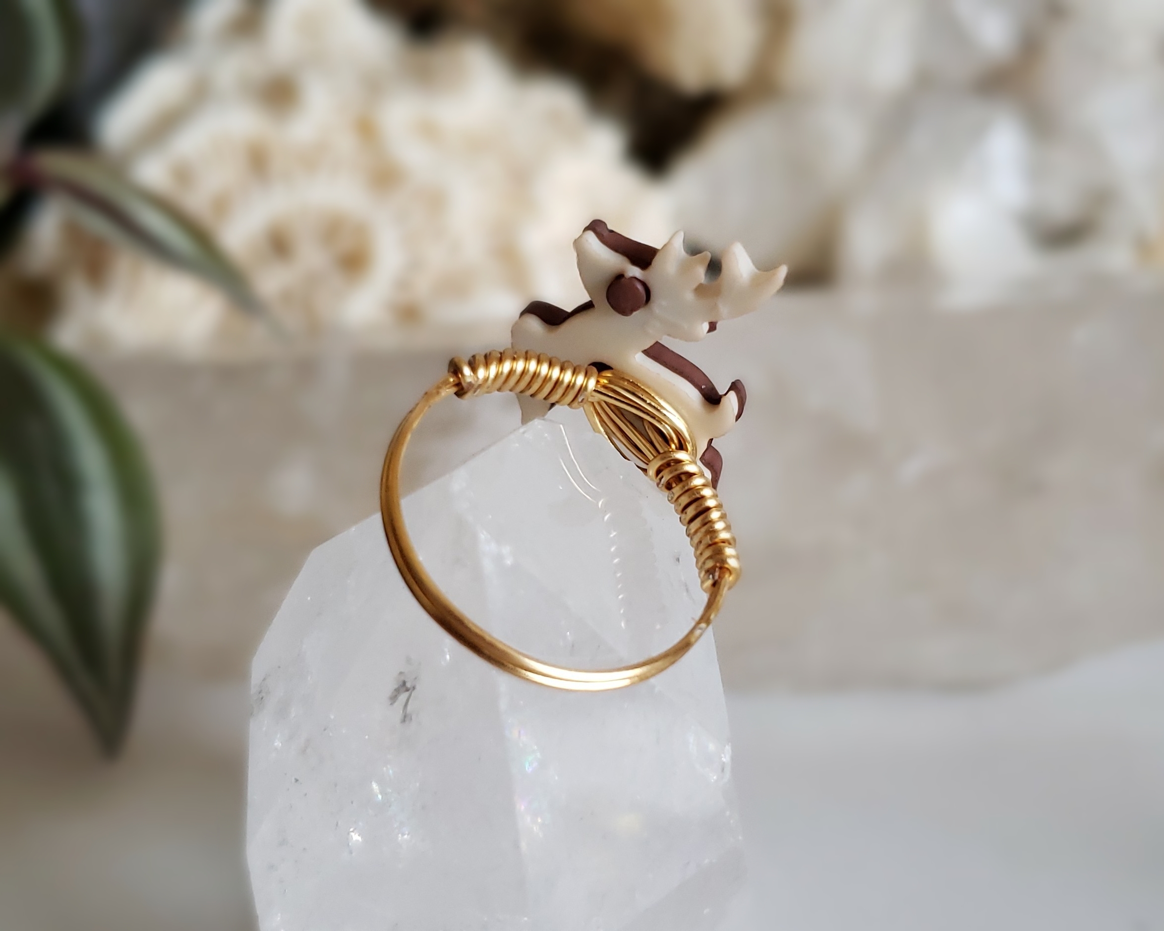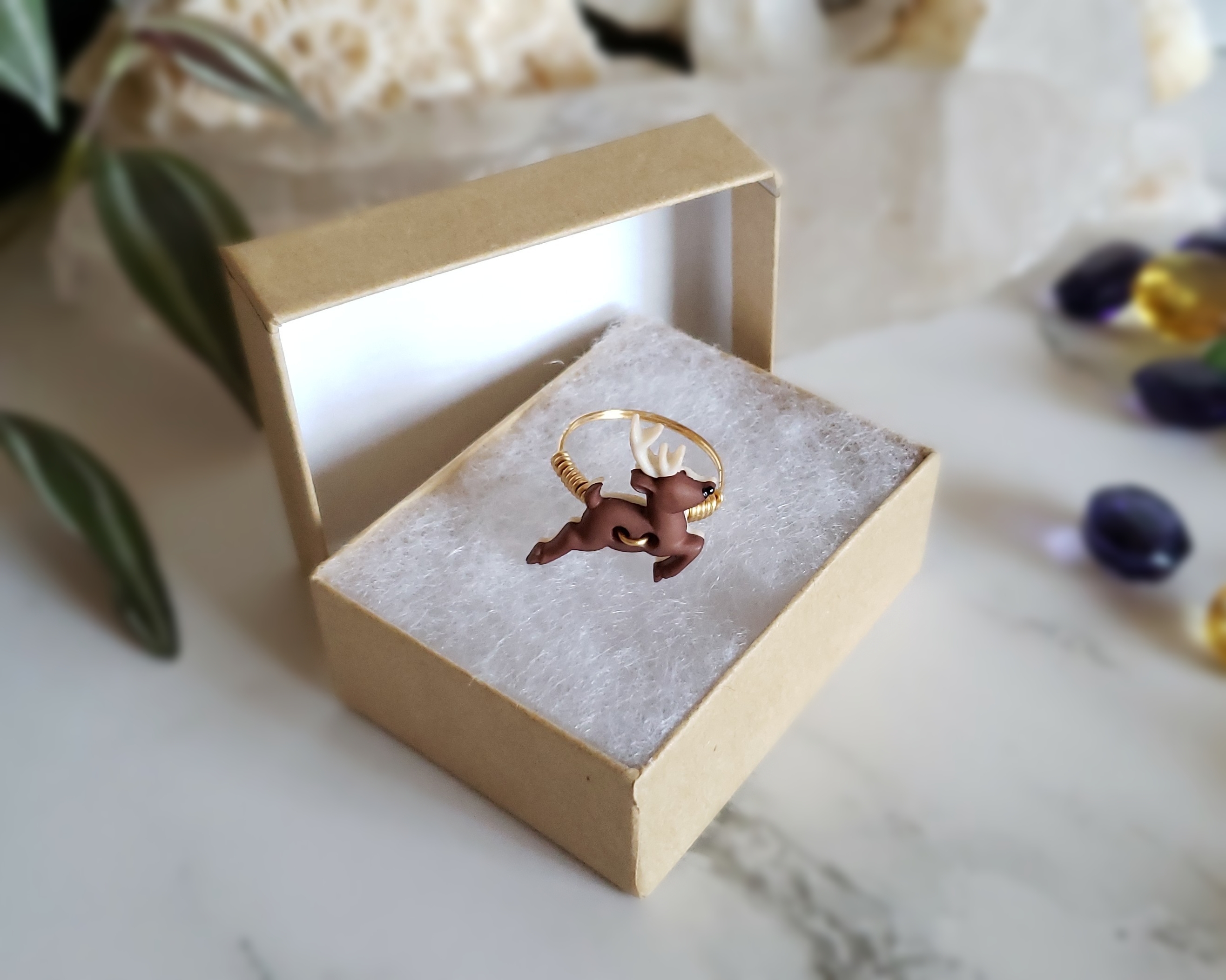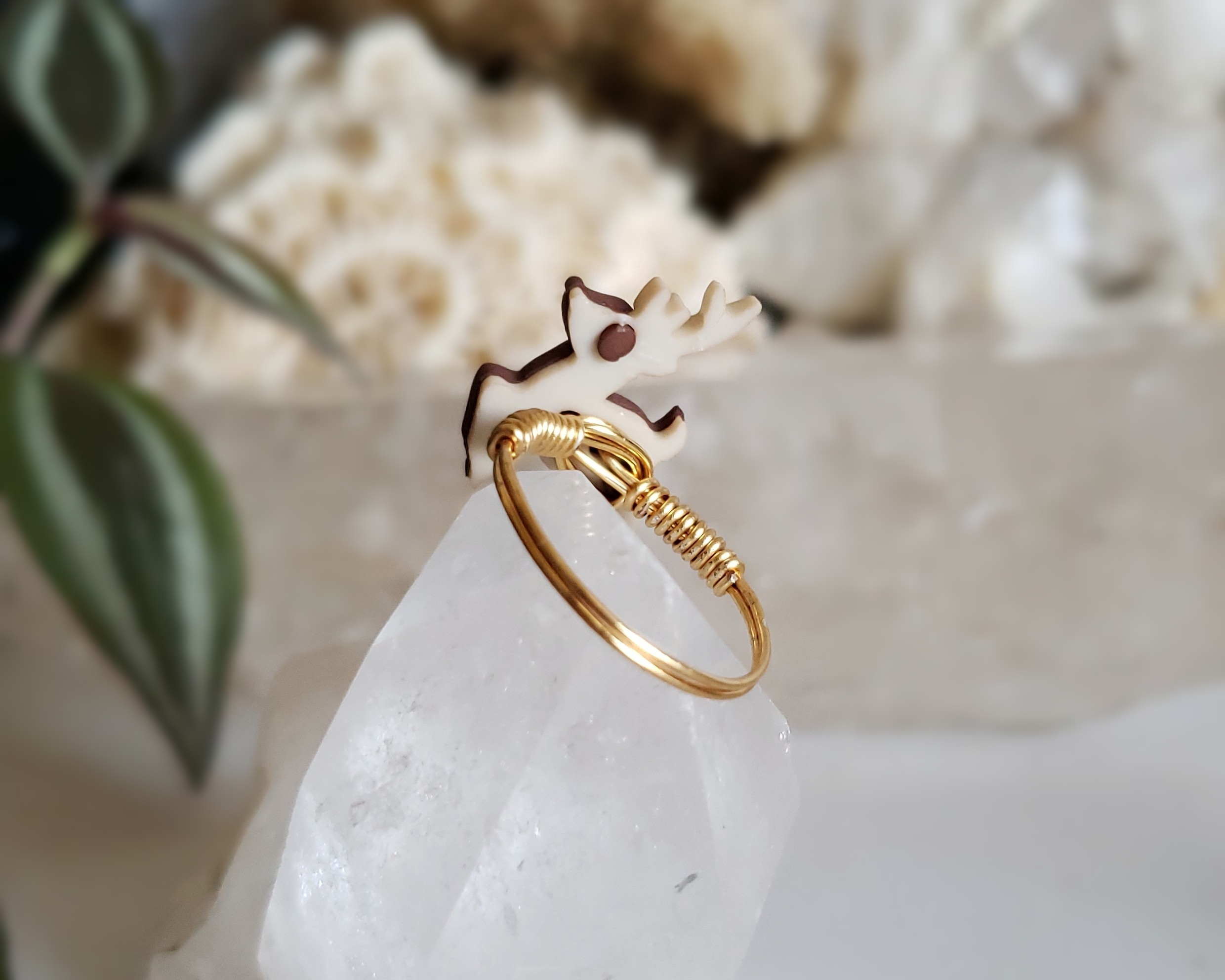 This is a custom sized deer ring for Luna in a size 8.5. Metal is a gold-colored, Sterling Silver wire. Deer is an upcycled button with an Acrylic back and a Silicone front.