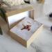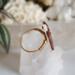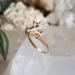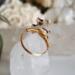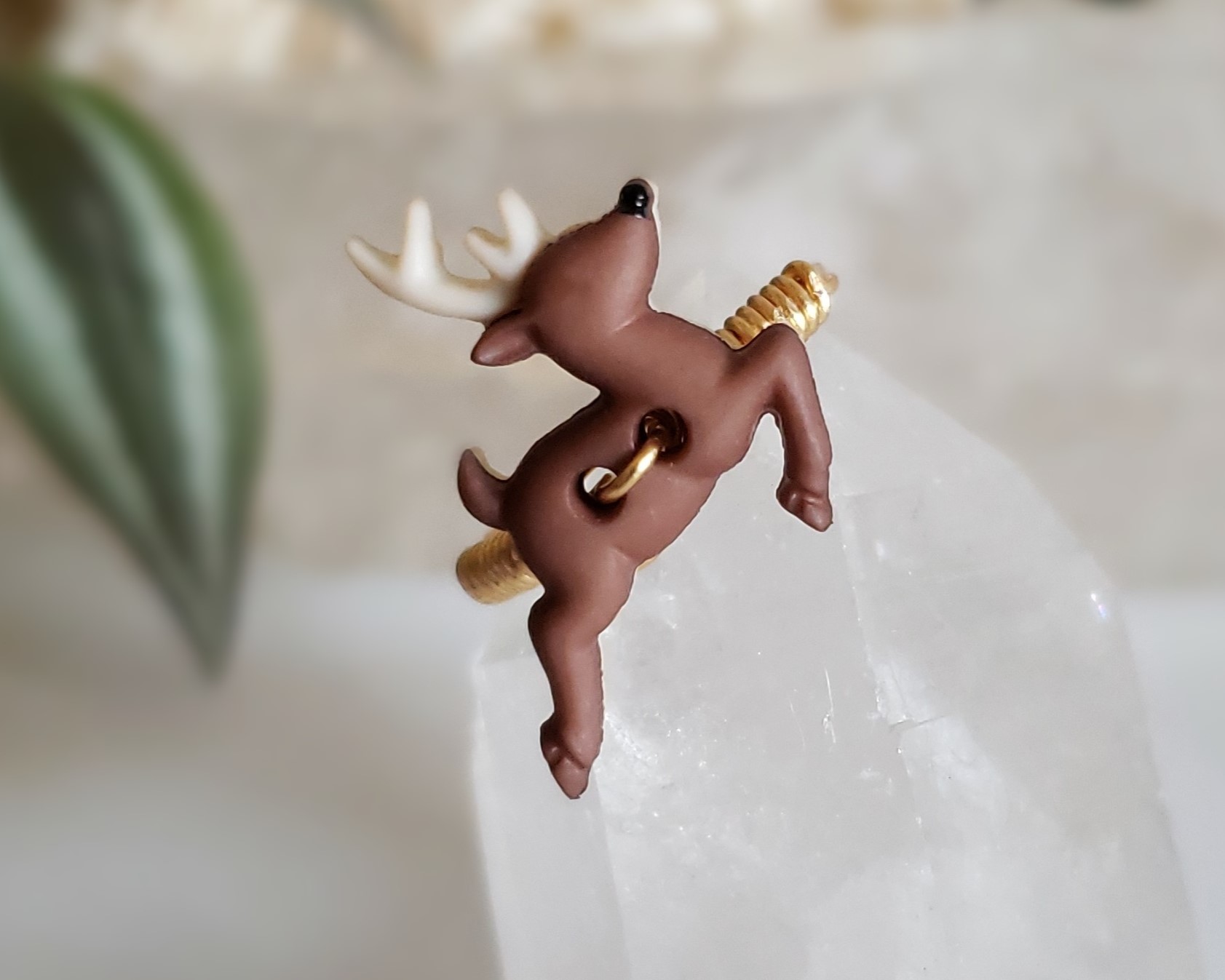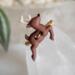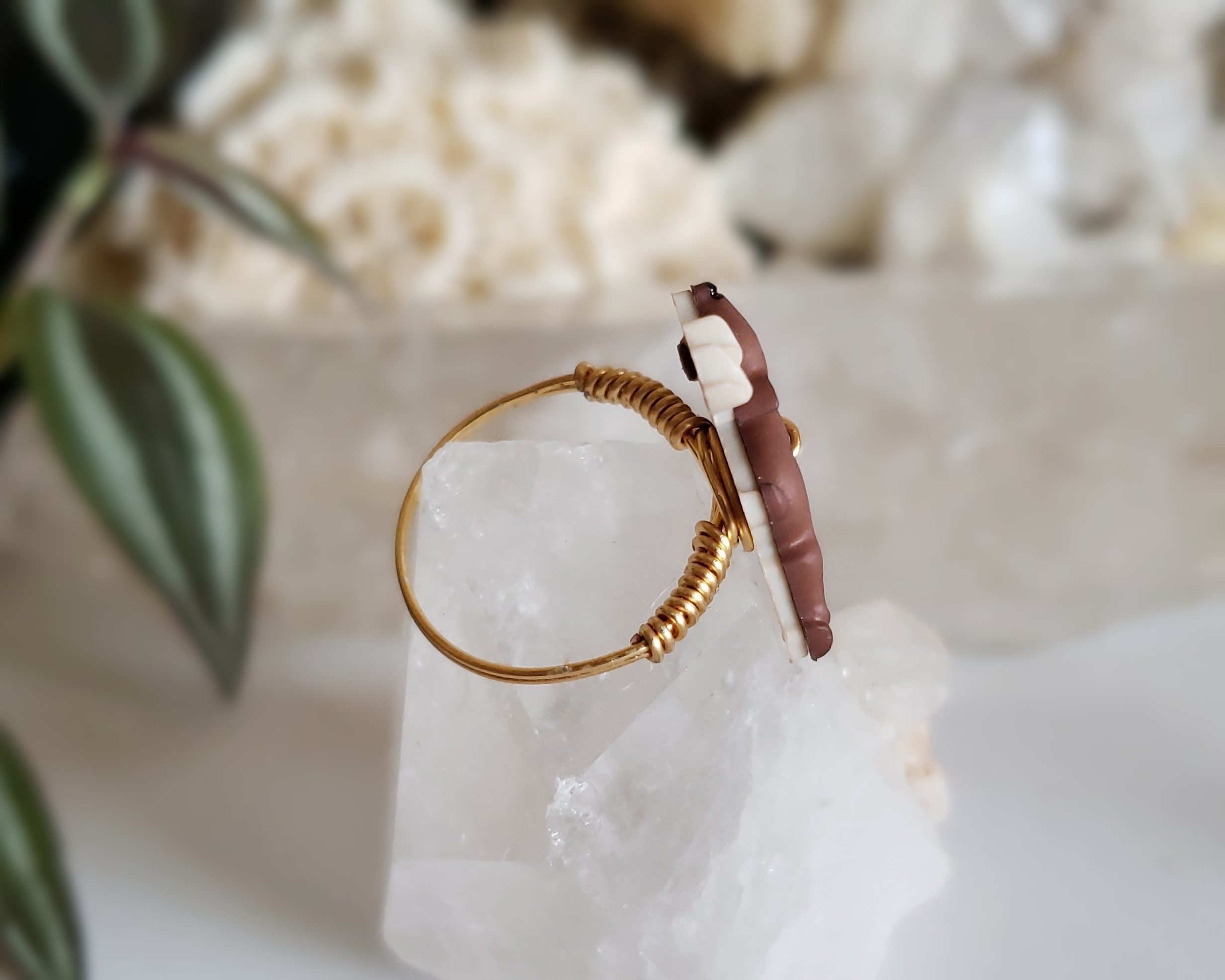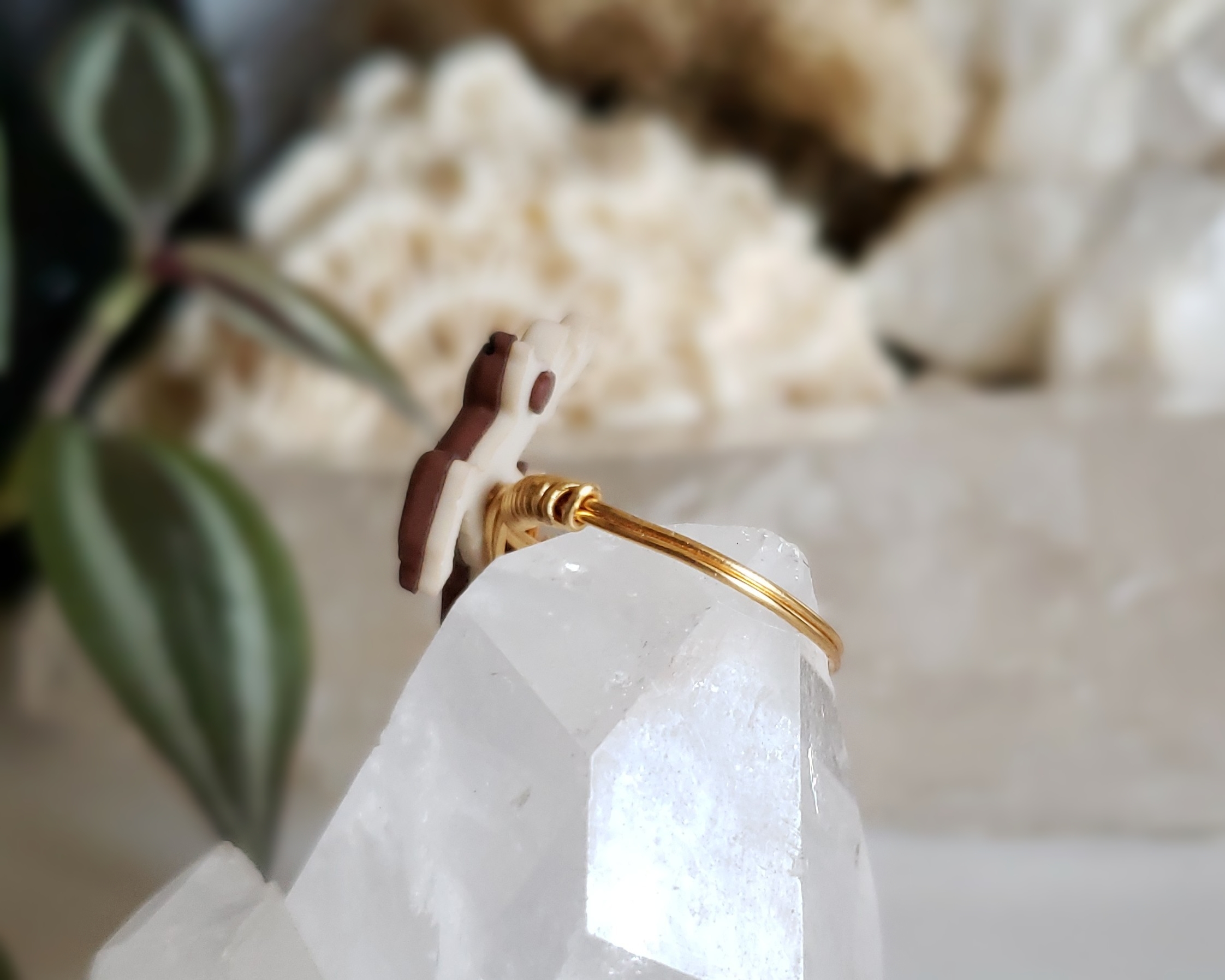 This is a custom sized deer ring for Luna in a size 8.5. Metal is a gold-colored, Sterling Silver wire. Deer is an upcycled button with an Acrylic back and a Silicone front.