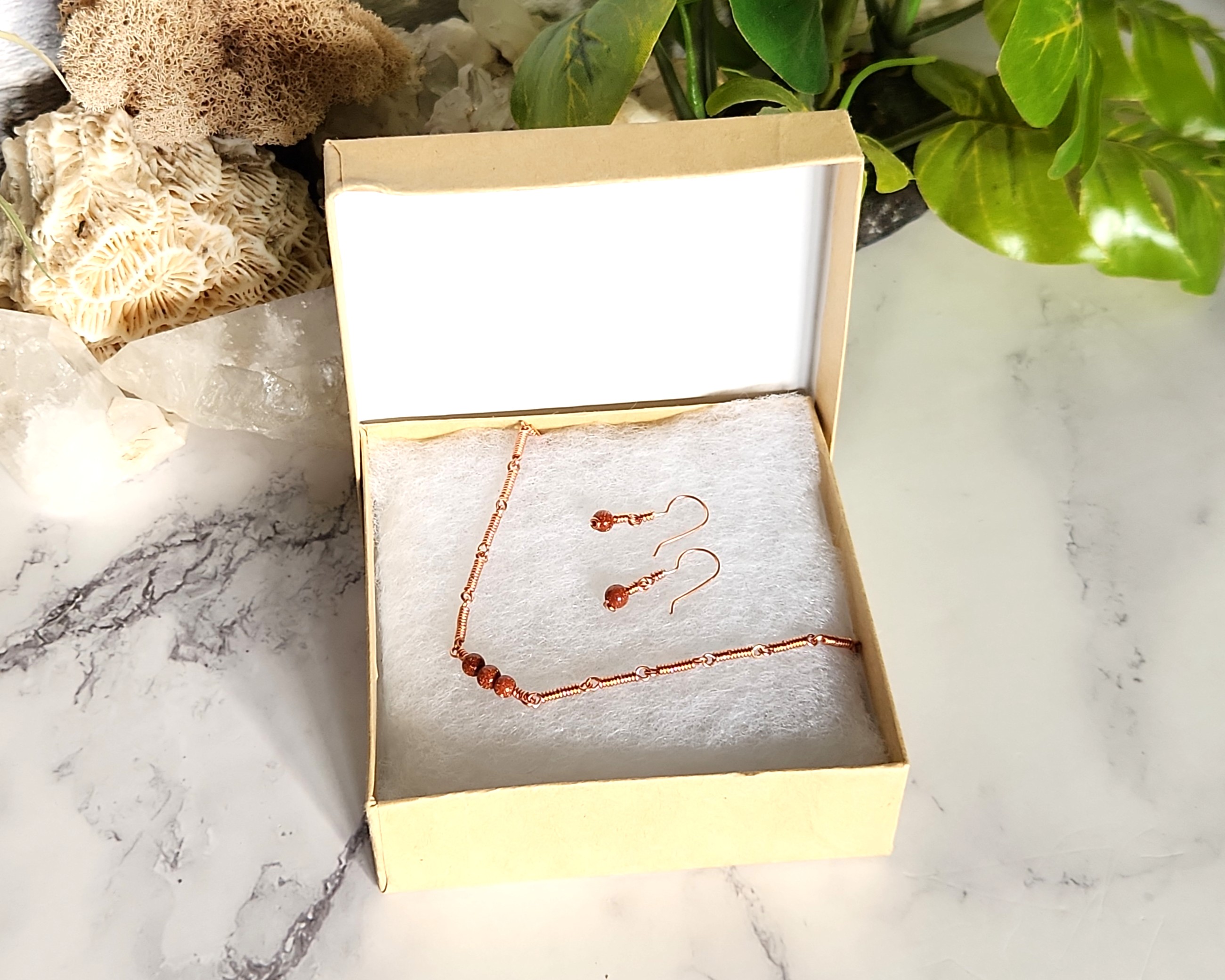 This delicate jewelry set is all about subtle sparkle with personality. The Copper wires add a warm, handcrafted charm, while the Goldstone beads bring little glimmers of light that catch the eye without overwhelming any outfit. The matching earrings measure 0.94 inches, perfect for everyday wear, and the necklace comes ready to ship at 16.93 inches, with the flexibility to custom-order your perfect length.
