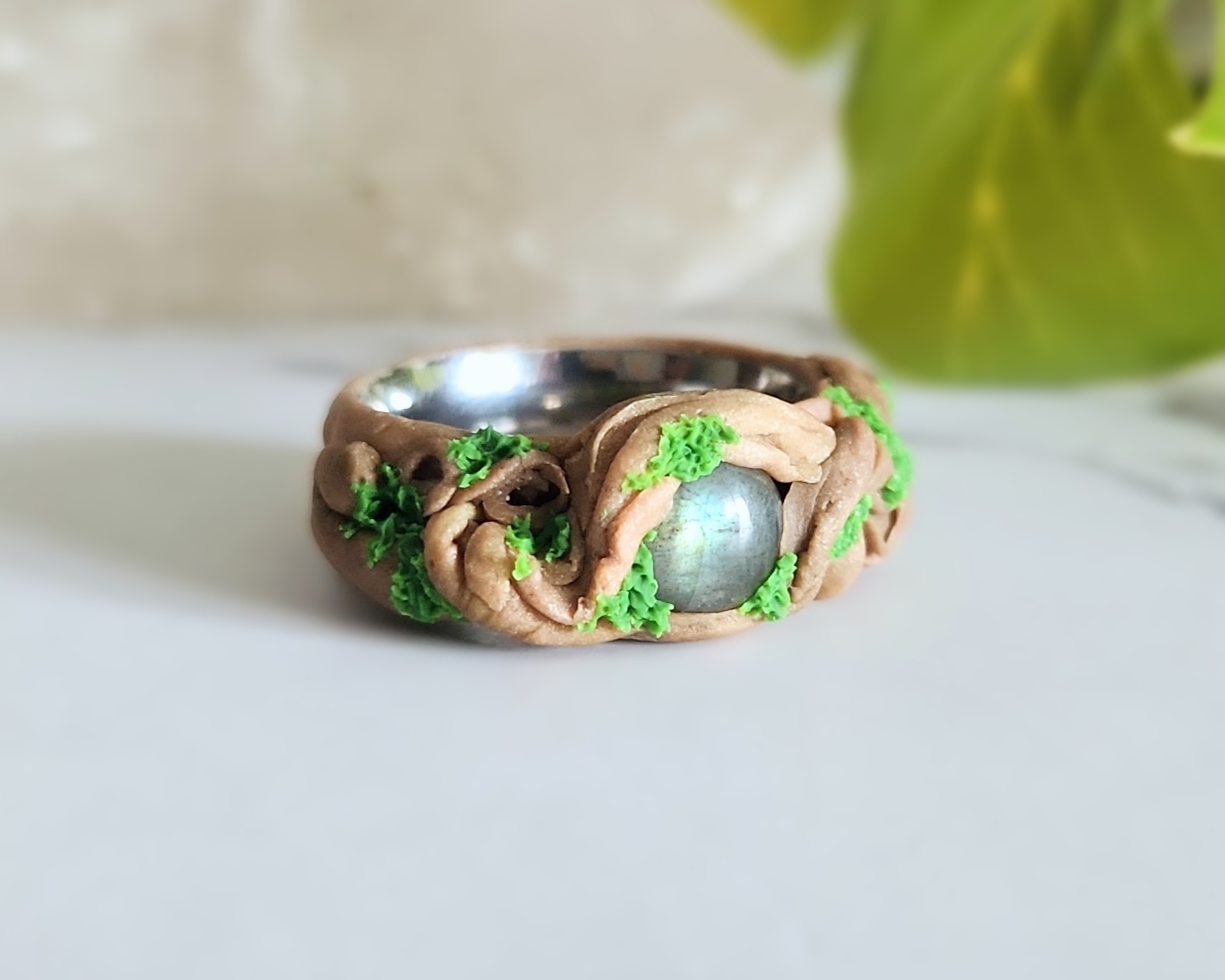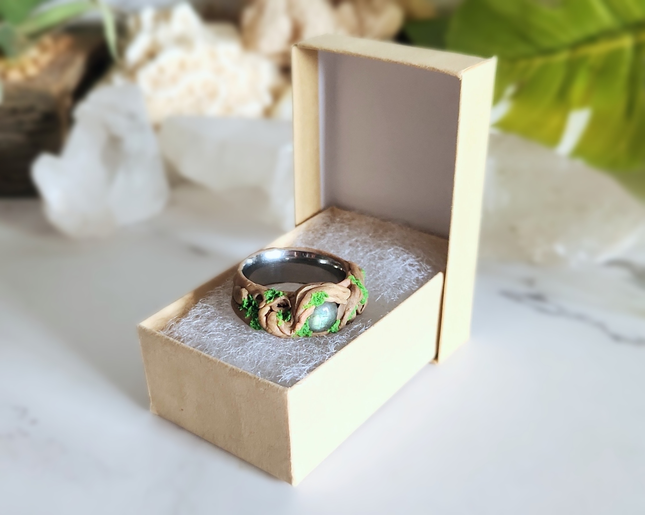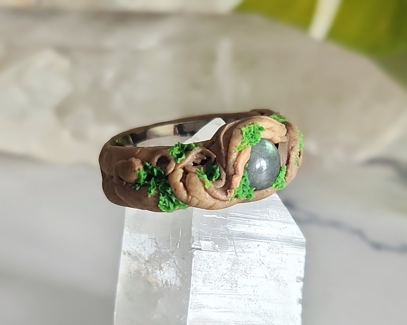 This ring feels like it could have been plucked straight from an enchanted forest. Built on a sturdy Stainless Steel base, it’s sculpted from Polymer Clay to resemble intertwining branches and tree roots, complete with little touches of green “moss” tucked into the curves. At its center rests a glowing Labradorite gemstone, catching the light with flashes of iridescence that shift like hidden magic beneath the surface. And here’s a secret- blended into the earthy browns of the clay is a glow-in-the-dark surprise, softly revealed only at night, like embers flickering beneath the forest floor. Measuring a size 10, it’s a piece that feels alive with story and character.