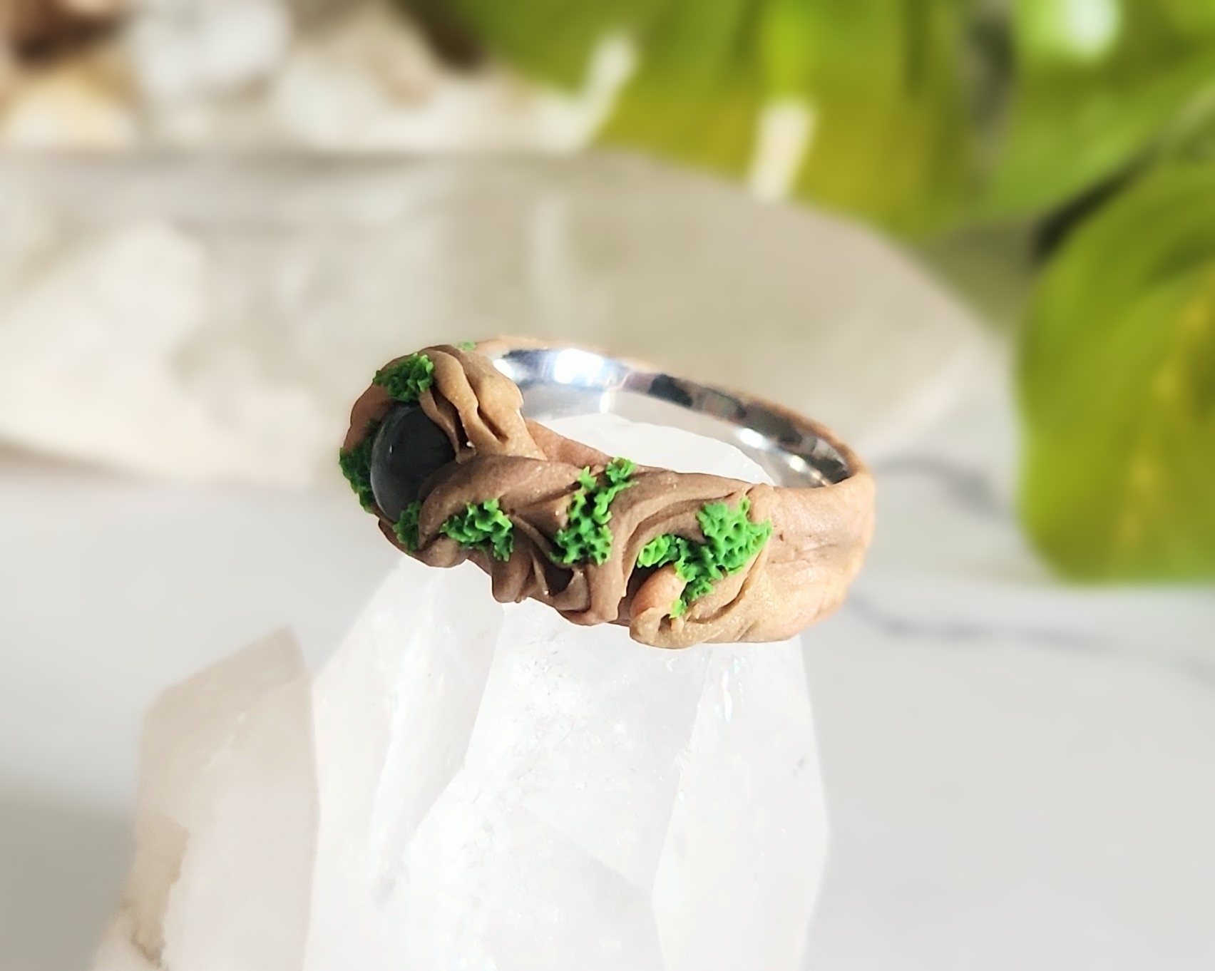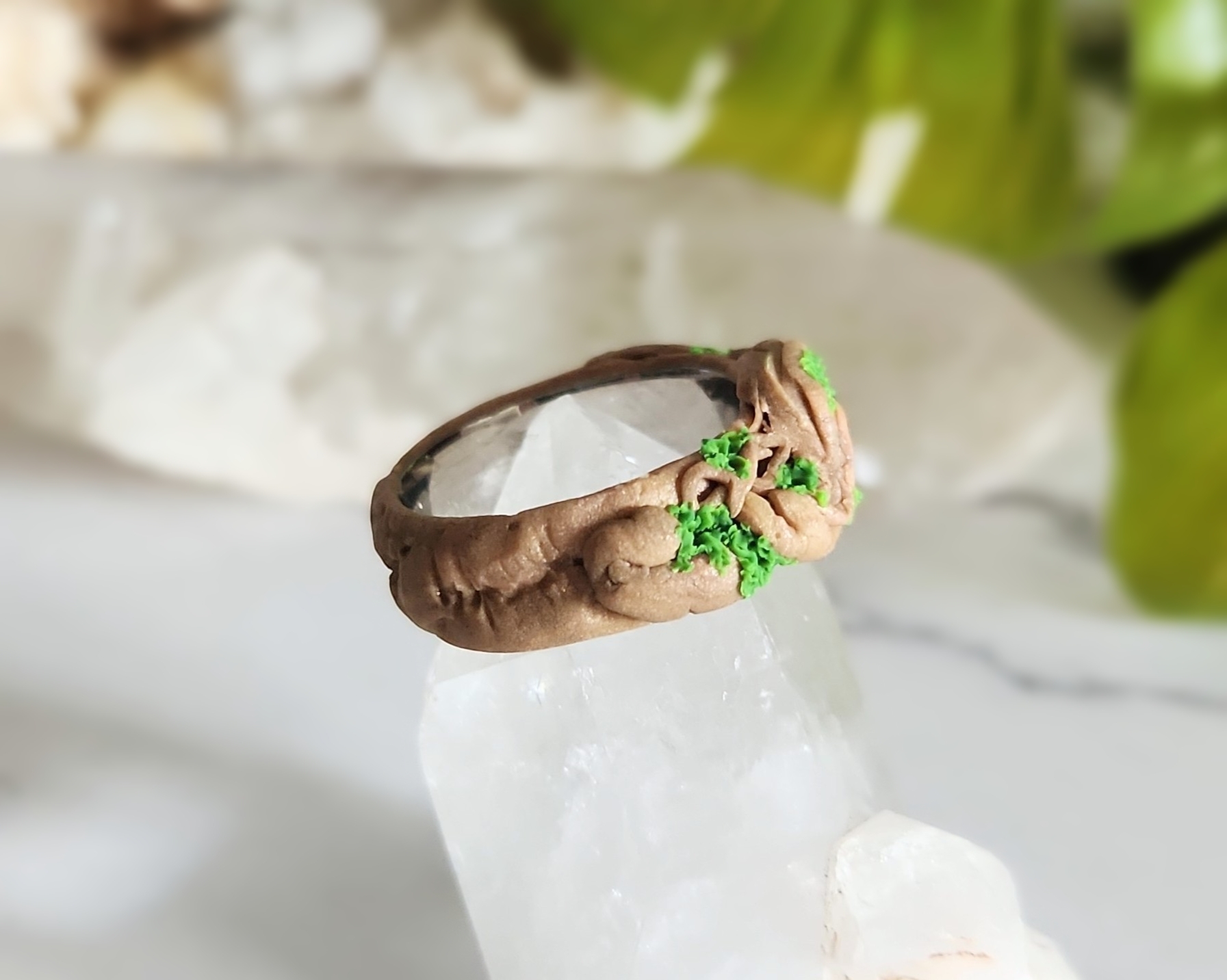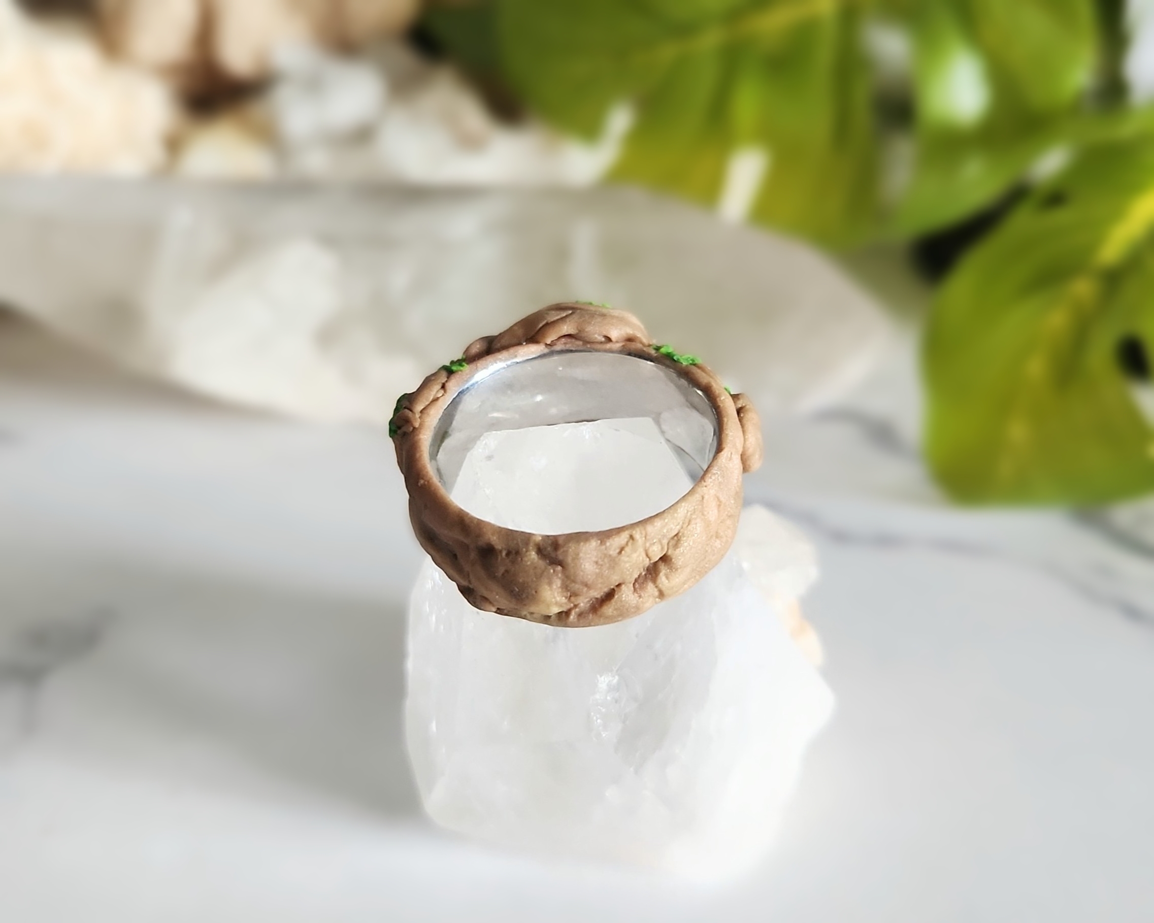 This ring feels like it could have been plucked straight from an enchanted forest. Built on a sturdy Stainless Steel base, it’s sculpted from Polymer Clay to resemble intertwining branches and tree roots, complete with little touches of green “moss” tucked into the curves. At its center rests a glowing Labradorite gemstone, catching the light with flashes of iridescence that shift like hidden magic beneath the surface. And here’s a secret- blended into the earthy browns of the clay is a glow-in-the-dark surprise, softly revealed only at night, like embers flickering beneath the forest floor. Measuring a size 10, it’s a piece that feels alive with story and character.