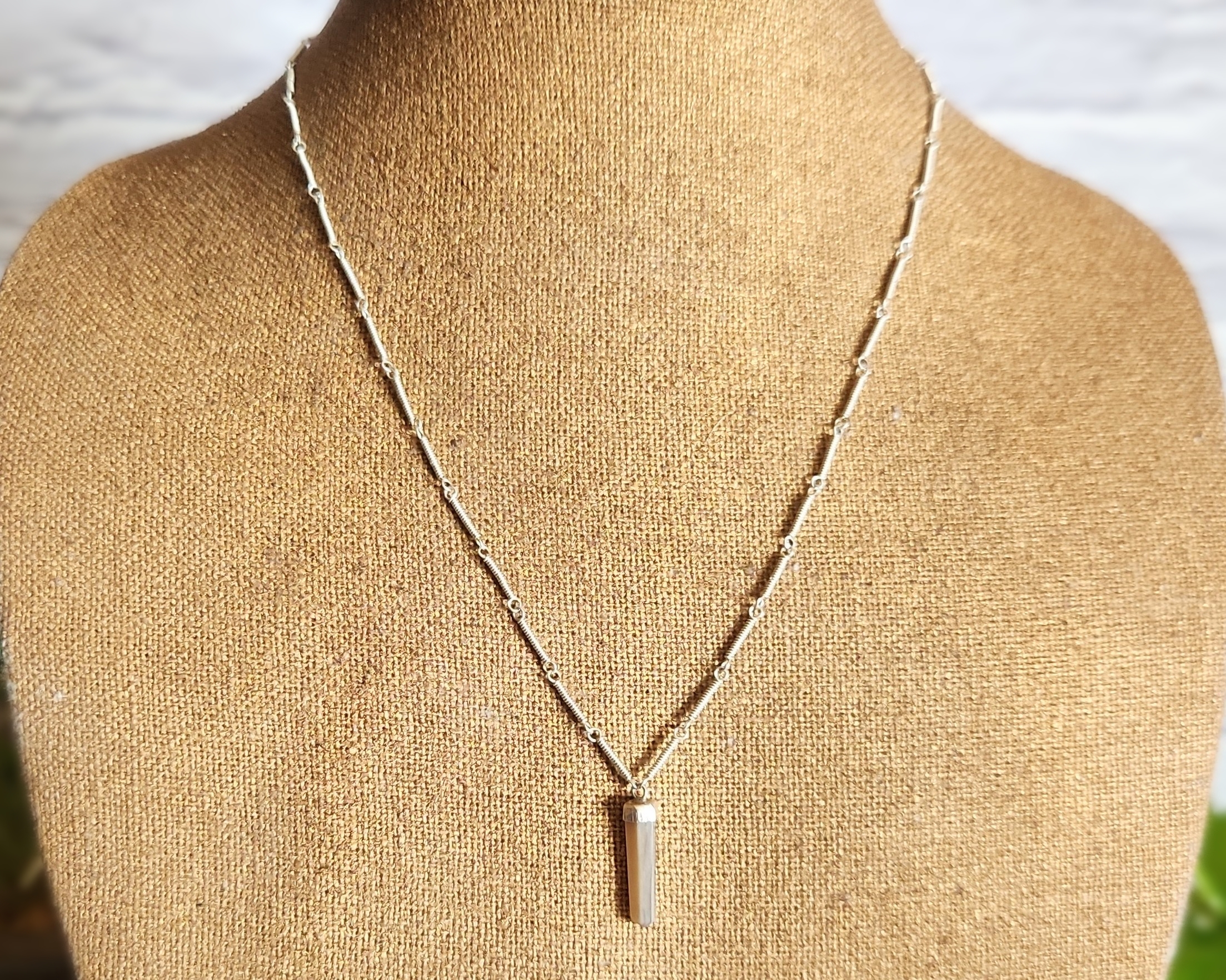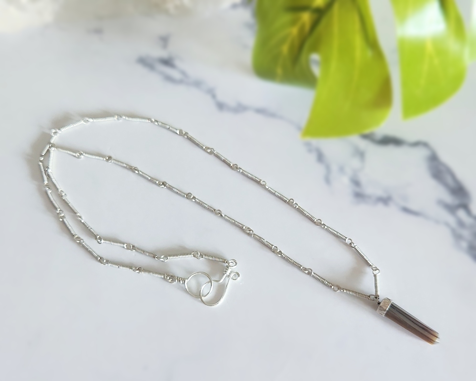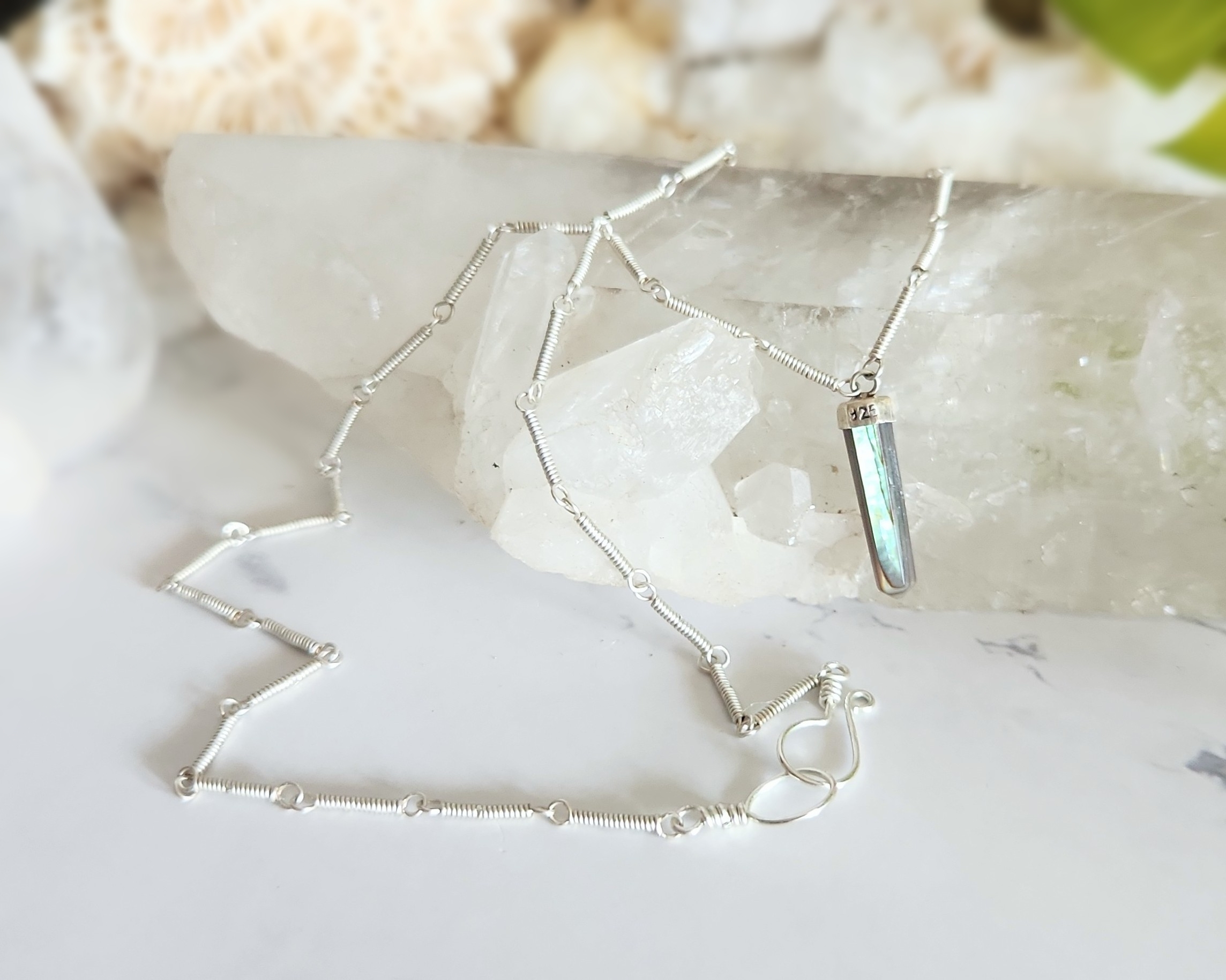 This necklace carries a story as radiant as the shimmer it gives off. Handcrafted from Sterling Silver wire, it features a luminous Mother of Pearl point pendant- repurposed from a single vintage earring that was missing its match. With a little imagination and care, it was transformed into the perfect centerpiece for this delicate design. The 16.5 inch Sterling Silver chain adds a touch of texture and artistry, while letting the iridescent glow of the pendant shine.