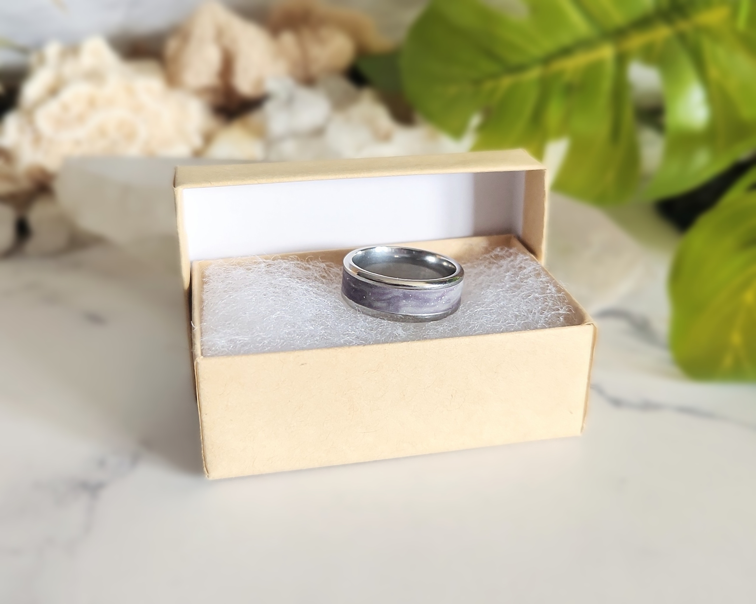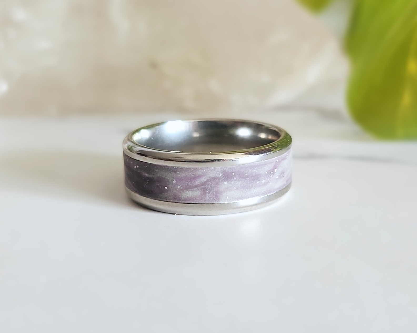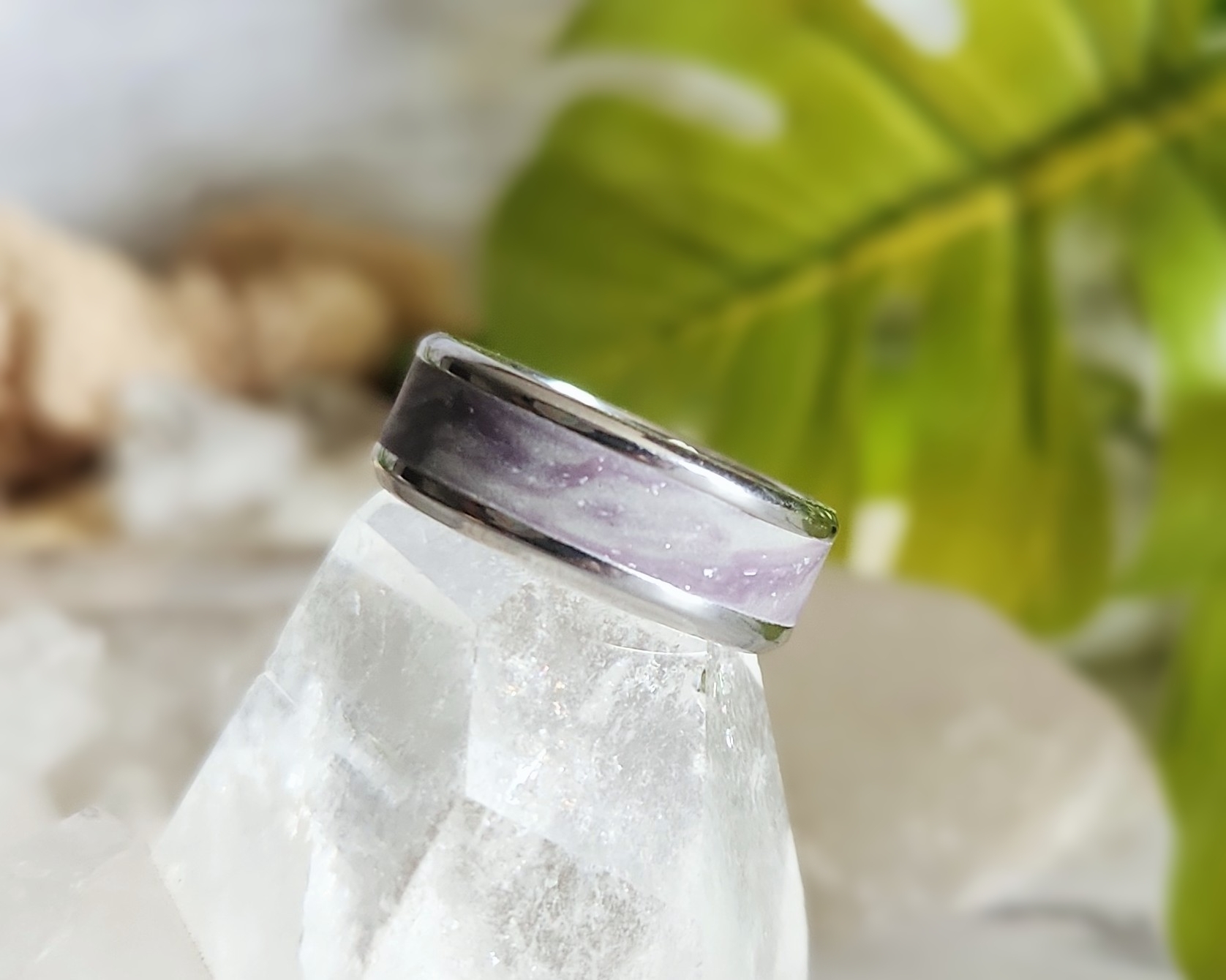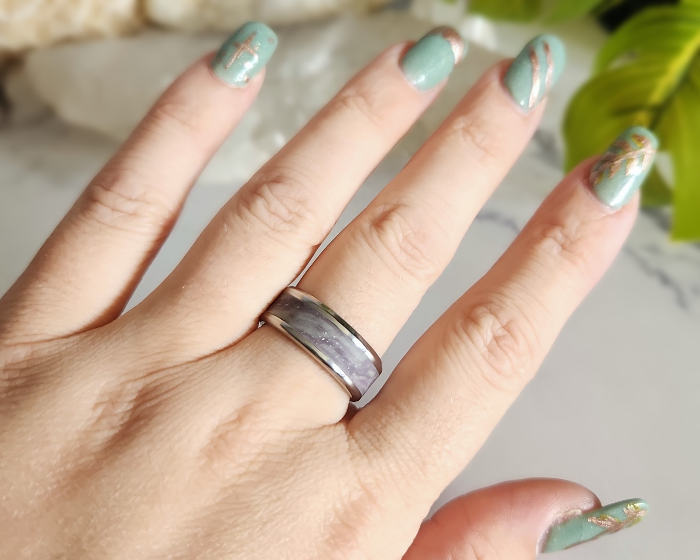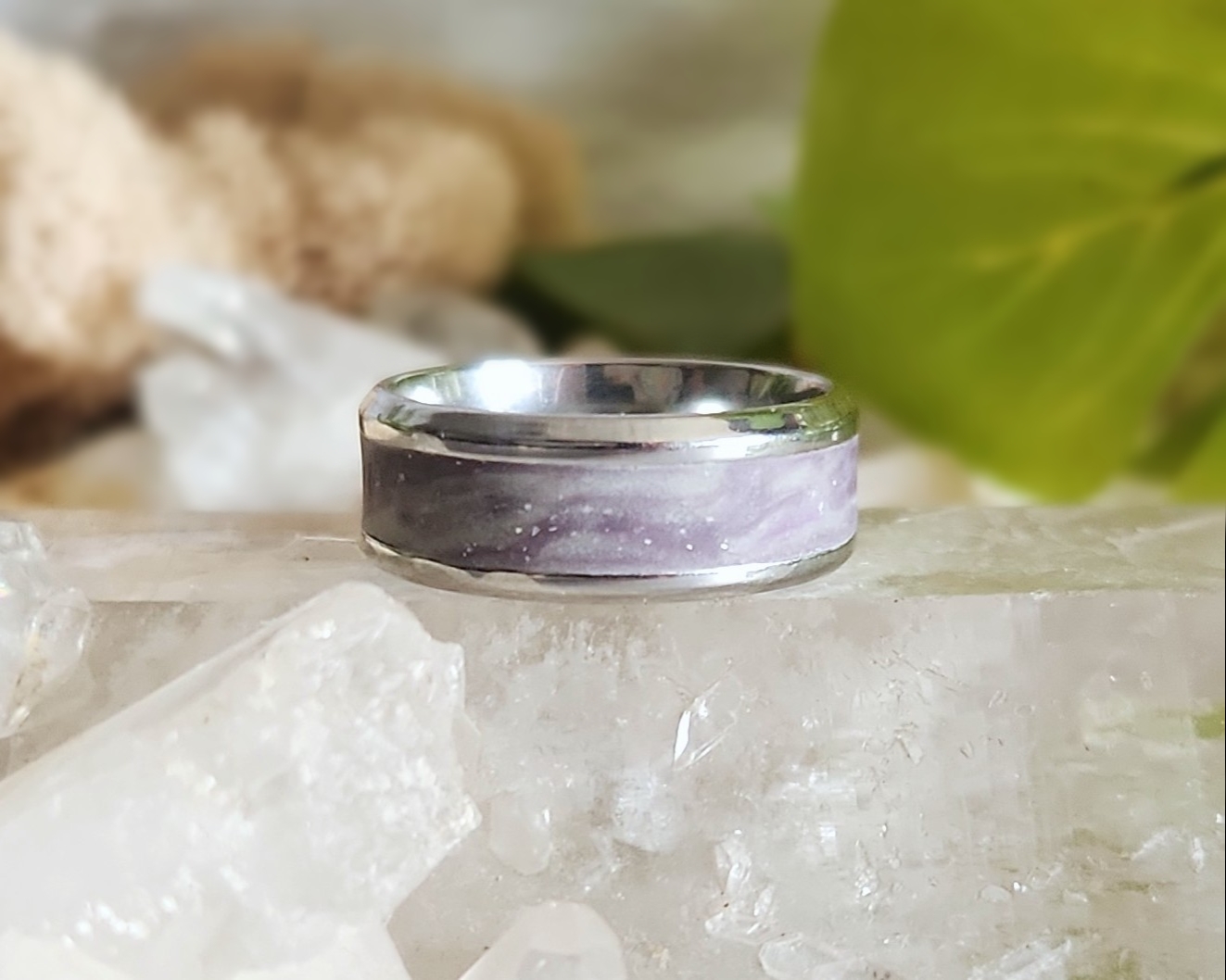 There’s something magical about the way this ring comes alive in different lights. Crafted on a sturdy Stainless Steel base, it’s layered with Polymer Clay that holds a wonderful surprise- when the lights go out, a bright glow shines through, making the sparkles and color blend dance like the Northern Lights across a night sky. By day, the speckled shimmer offers a subtle celestial touch, and by night, it reveals a dreamy hidden world. Available in sizes 8, 10, and 12, it’s a versatile piece that works beautifully for any gender.