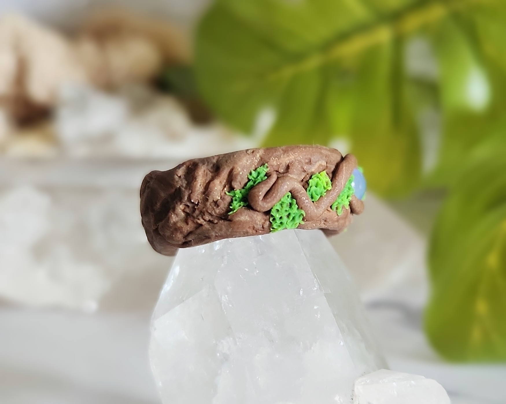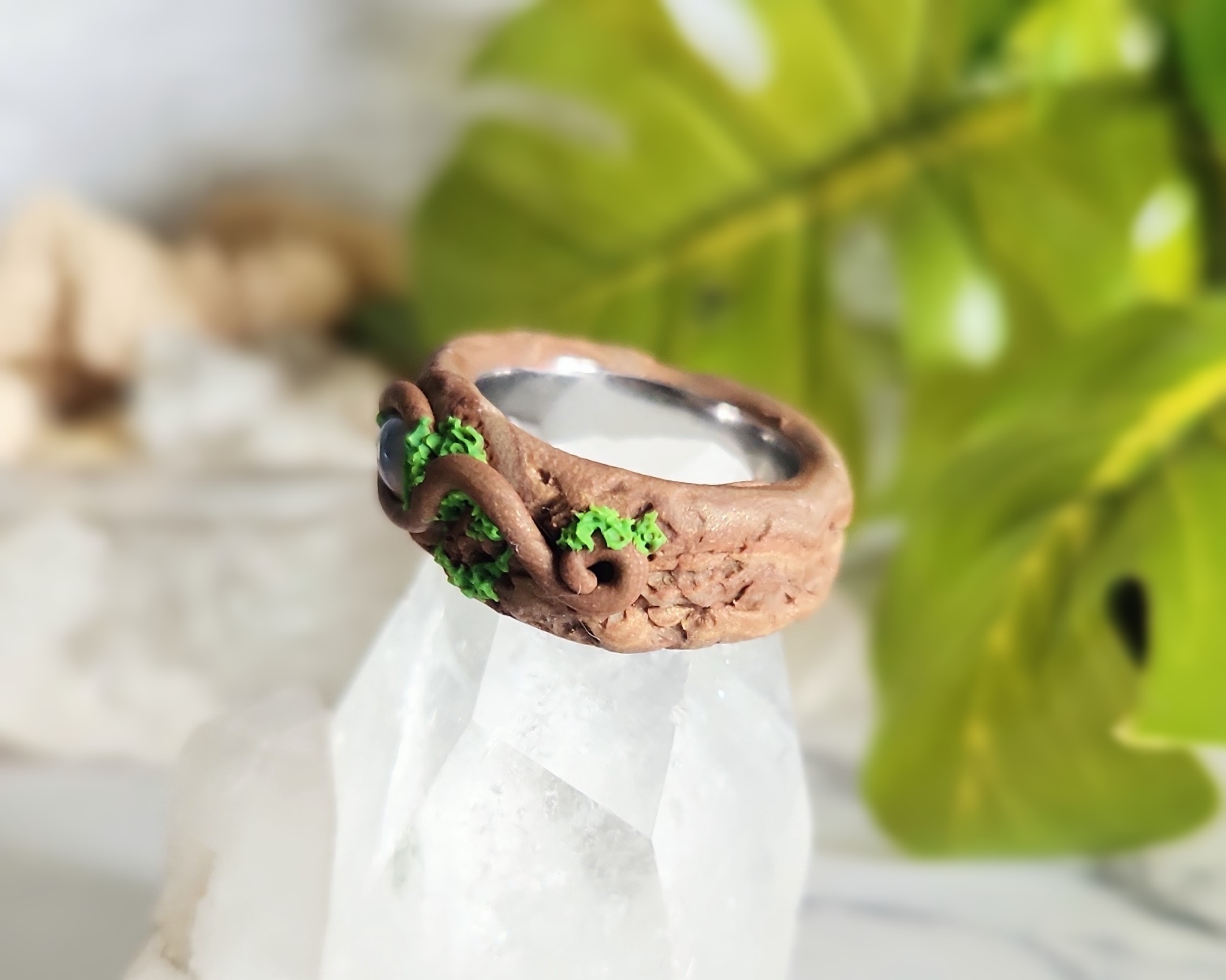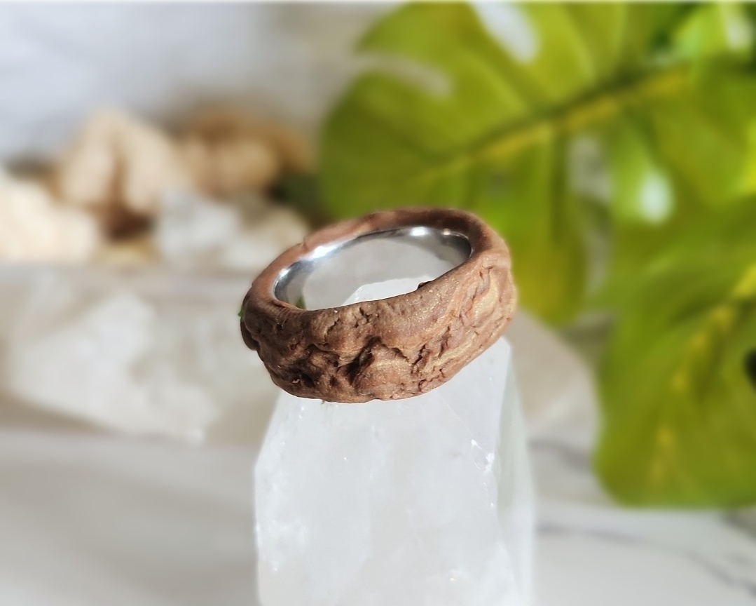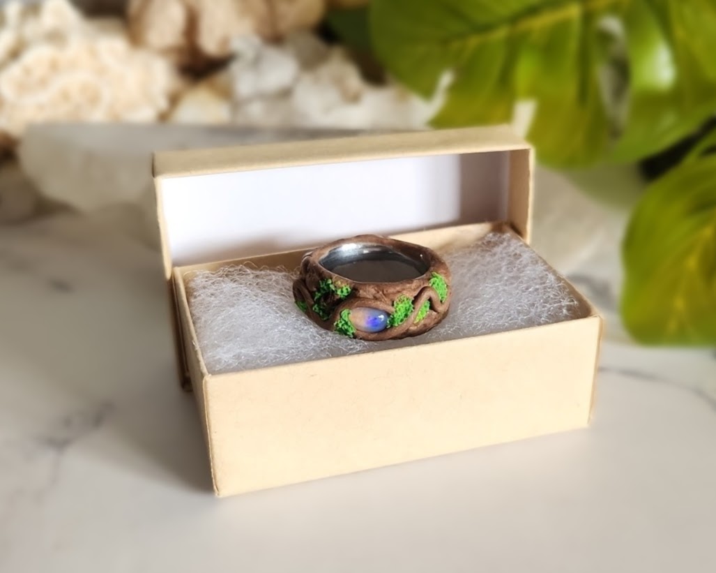 This ring feels like a little piece of magic you can wear every day. Crafted on a sturdy Stainless Steel base, it’s sculpted with Polymer Clay to frame a glowing Ethiopian Opal at its center. Soft swirls of earthy tones create the look of natural textures, while a hidden glow-in-the-dark blend adds a special surprise- subtle by day, luminous by night. Measuring a size 9, it’s a versatile unisex piece designed to be both striking and comfortable.