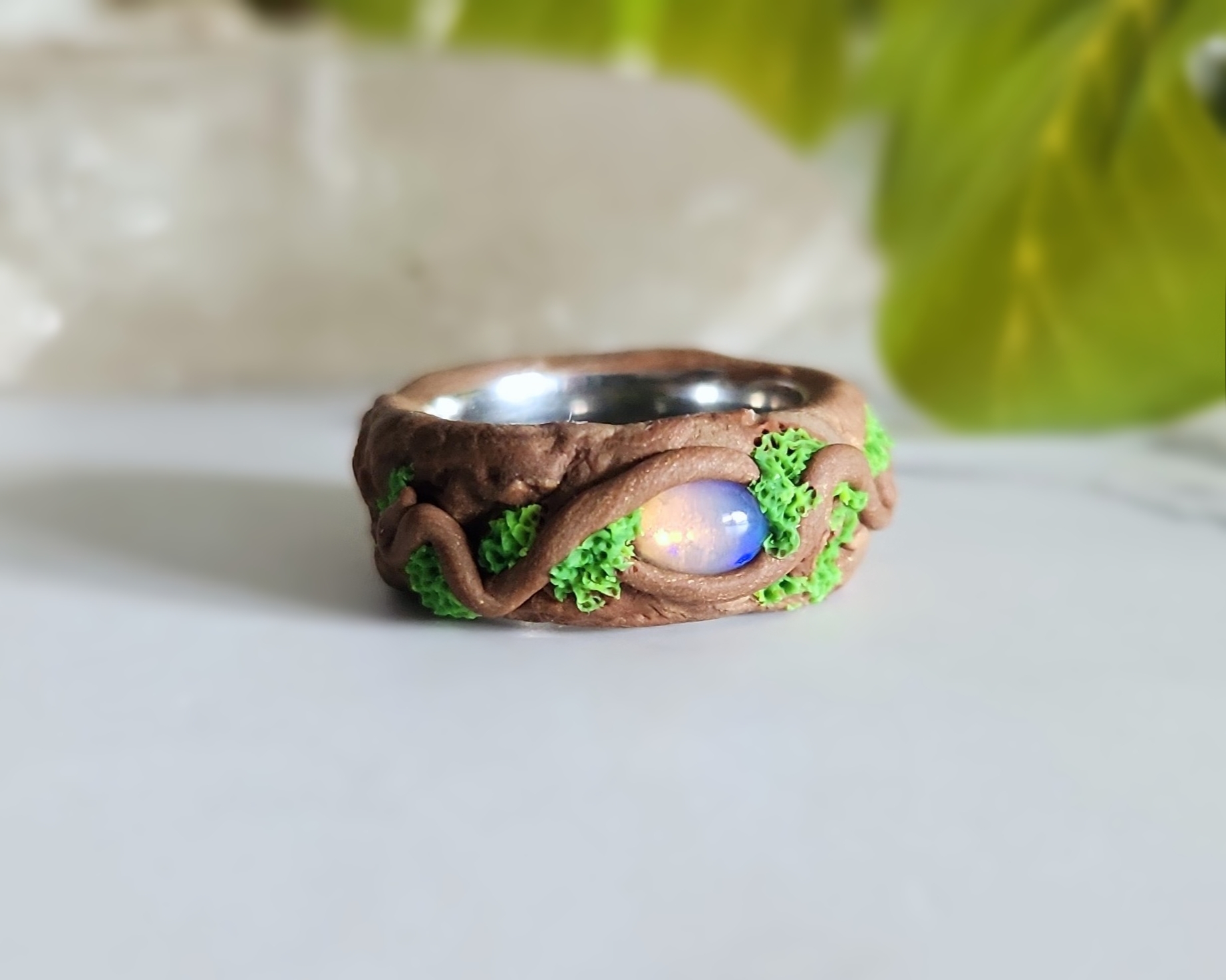 This ring was made with an Opal gemstone and Polymer Clay on a Stainless Steel ring blank.