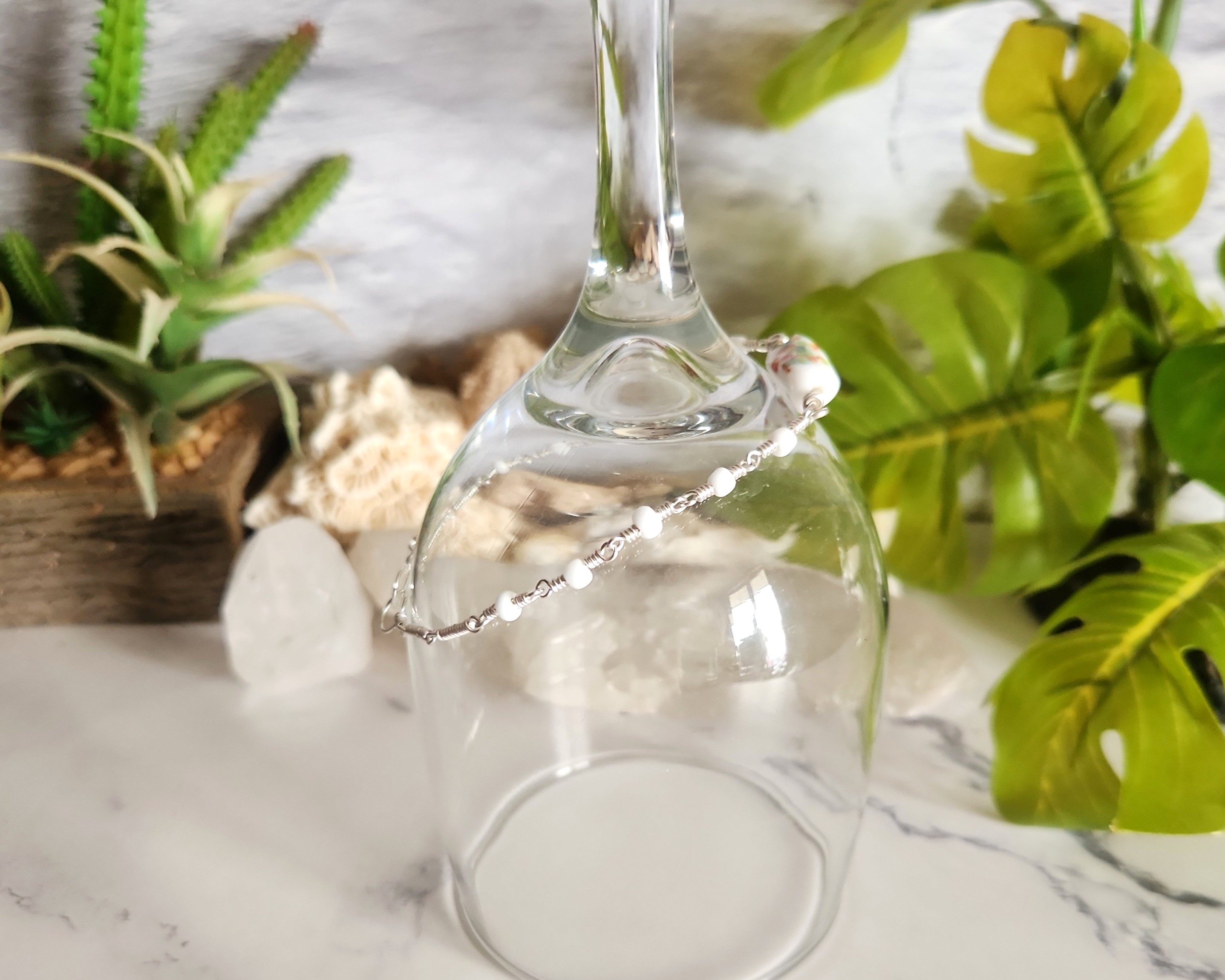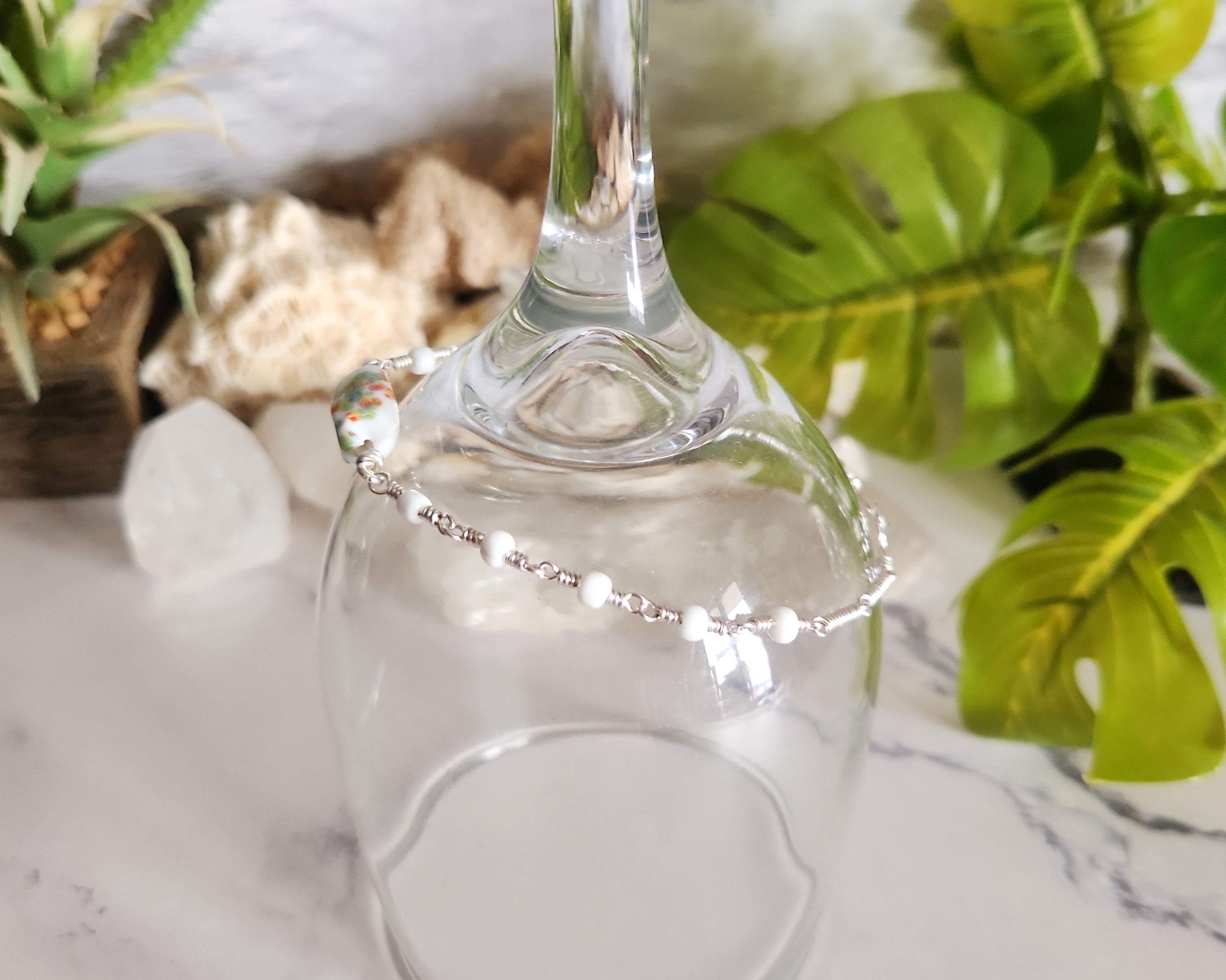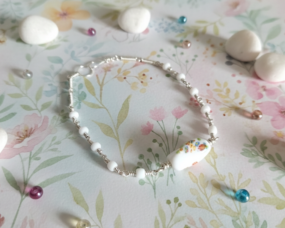 This bracelet feels like a small celebration of spring, blending bright simplicity with a touch of nostalgic charm. Handcrafted from Sterling Silver wire, the delicate wrapped links create clean, graceful lines that feel light on the wrist while still offering a sense of intention and care. Small glass beads are spaced throughout, adding gentle texture and balance without overpowering the design.