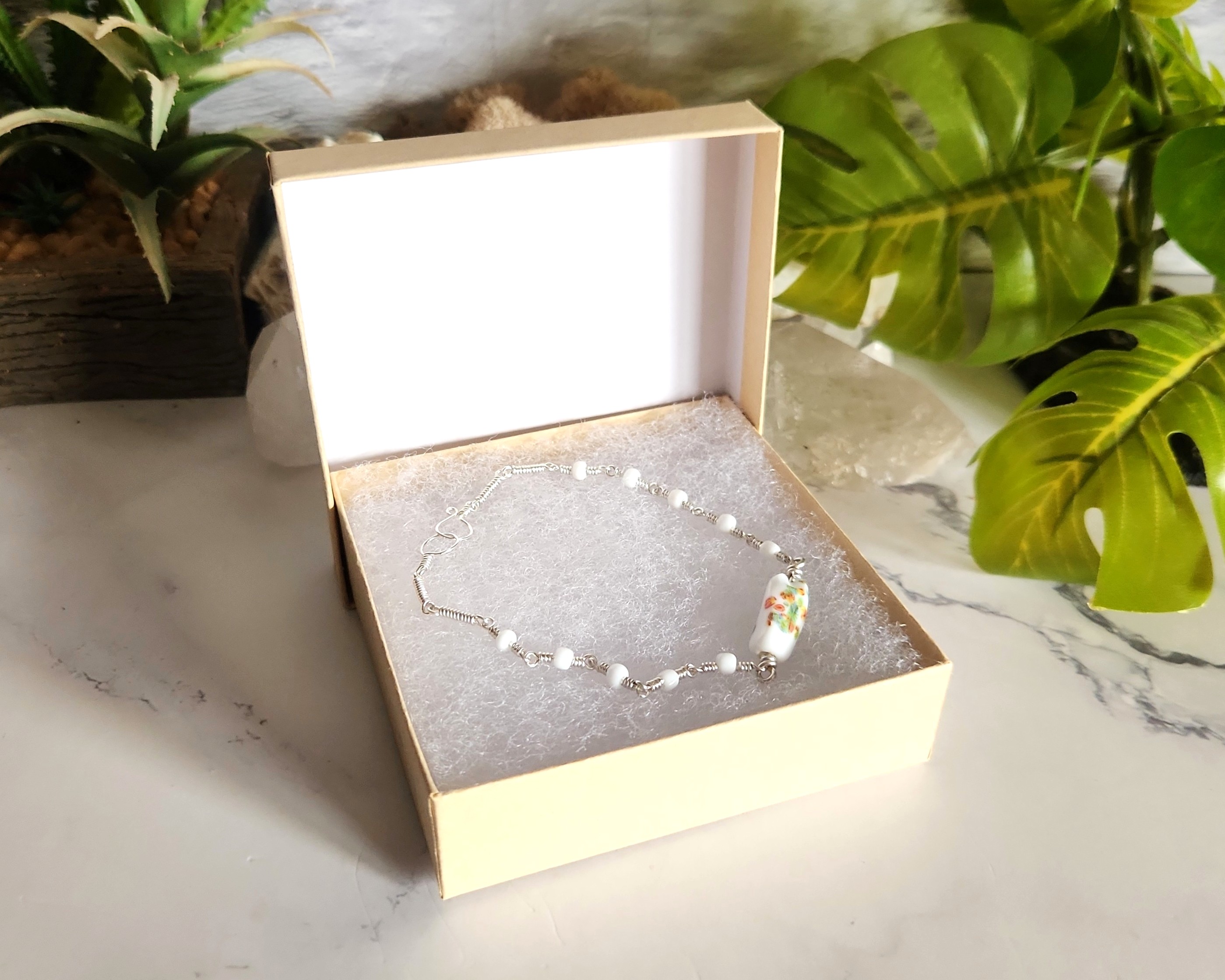 At the heart of the bracelet sits an upcycled vintage Porcelain bead, finished with a sweet floral motif that brings a quiet pop of color and personality. The porcelain’s smooth surface and unique pattern give the piece a collected, one-of-a-kind feel, as if it carries a little story from another time. Measuring 8.58 inches, this bracelet drapes comfortably and makes an easy everyday companion while still feeling special enough to notice.