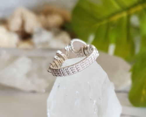 This sweet and serene ring feels like a gentle ocean breeze captured in silver. Made from Sterling Silver wire and featuring a larger Rose Quartz gemstone, it shimmers with a soft, romantic glow. The delicate loops encircling the stone resemble waves rolling onto the shore; a graceful reminder of life’s steady rhythms and the beauty of emotional flow. Measuring size 6, it’s comfortable, elegant, and easy to fall in love with.