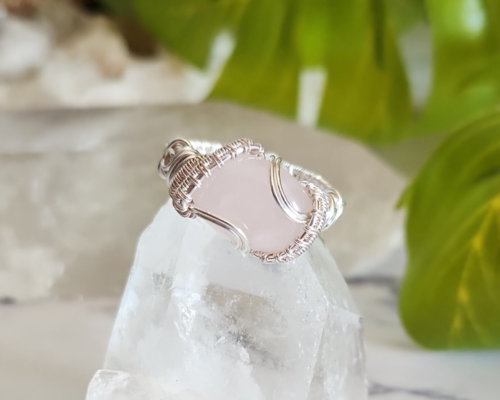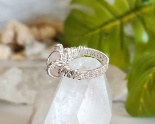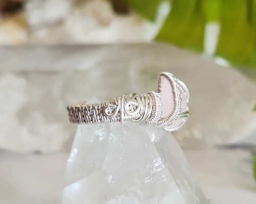 This ring was made with a Rose Quartz gemstone cabochon and Sterling Silver wires.