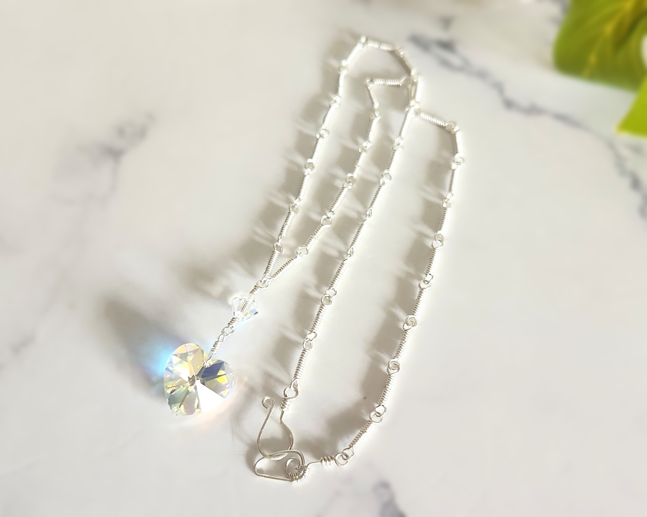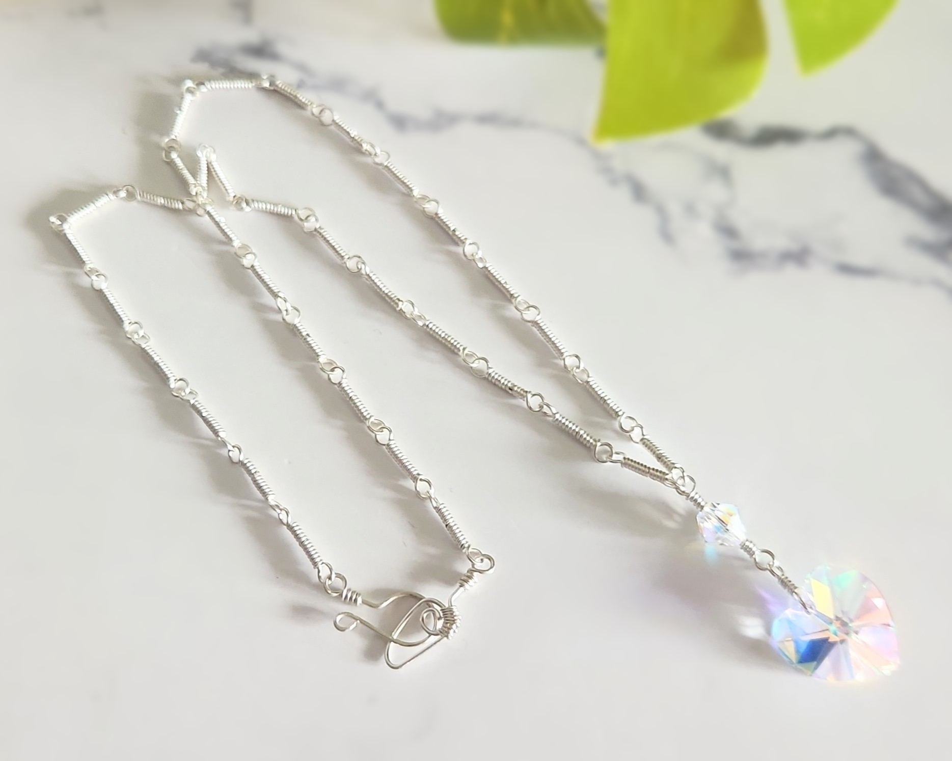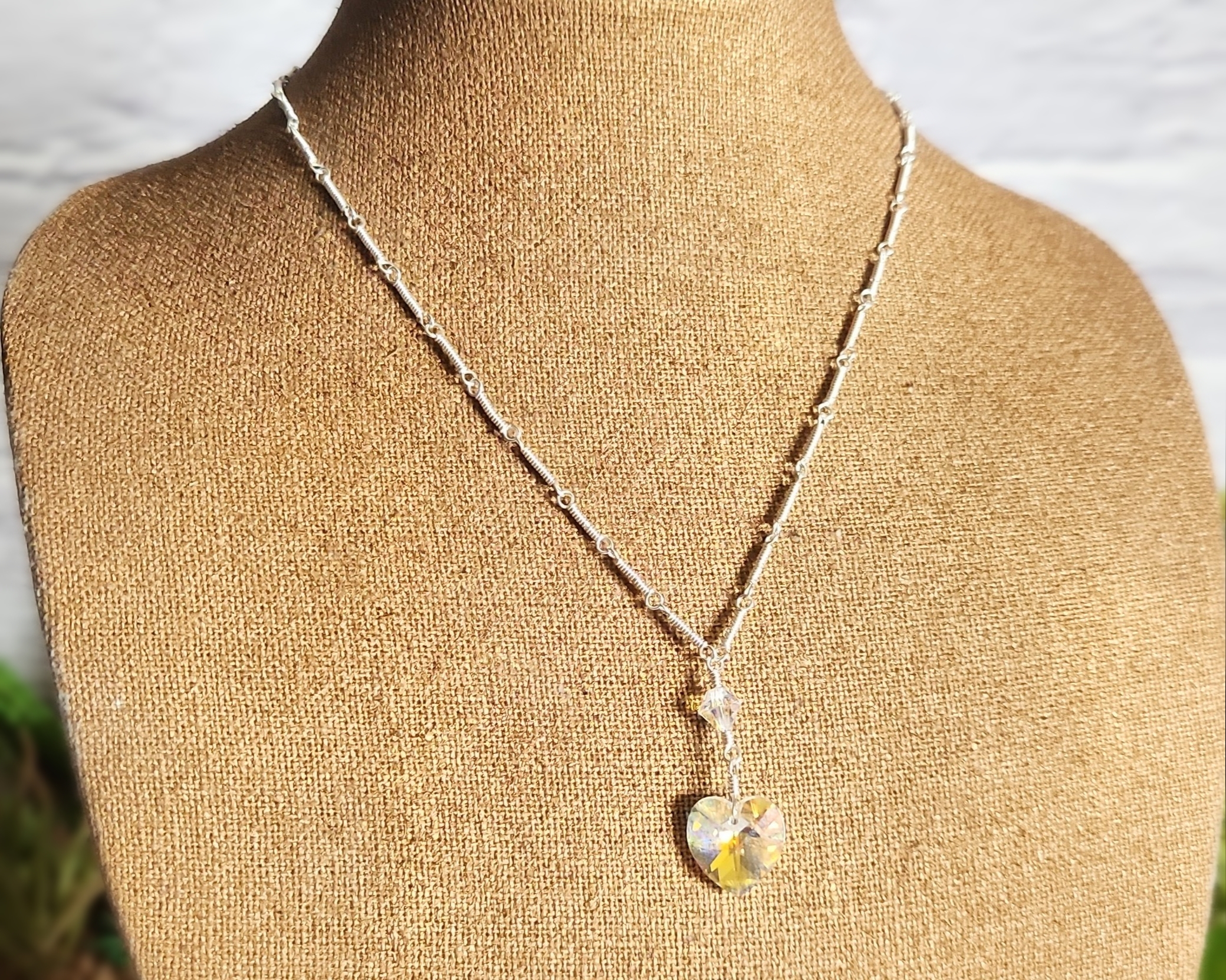 This necklace was crafted with Sterling Silver wires, and upcycled, vintage aroura borealis glass crystal beads in bicone and heart shapes.