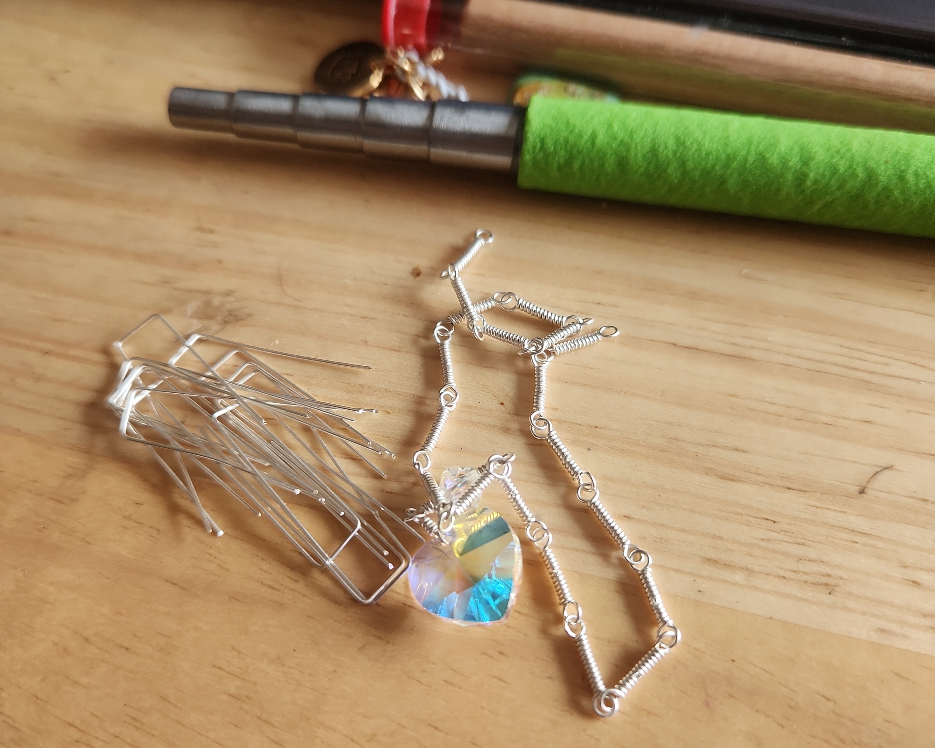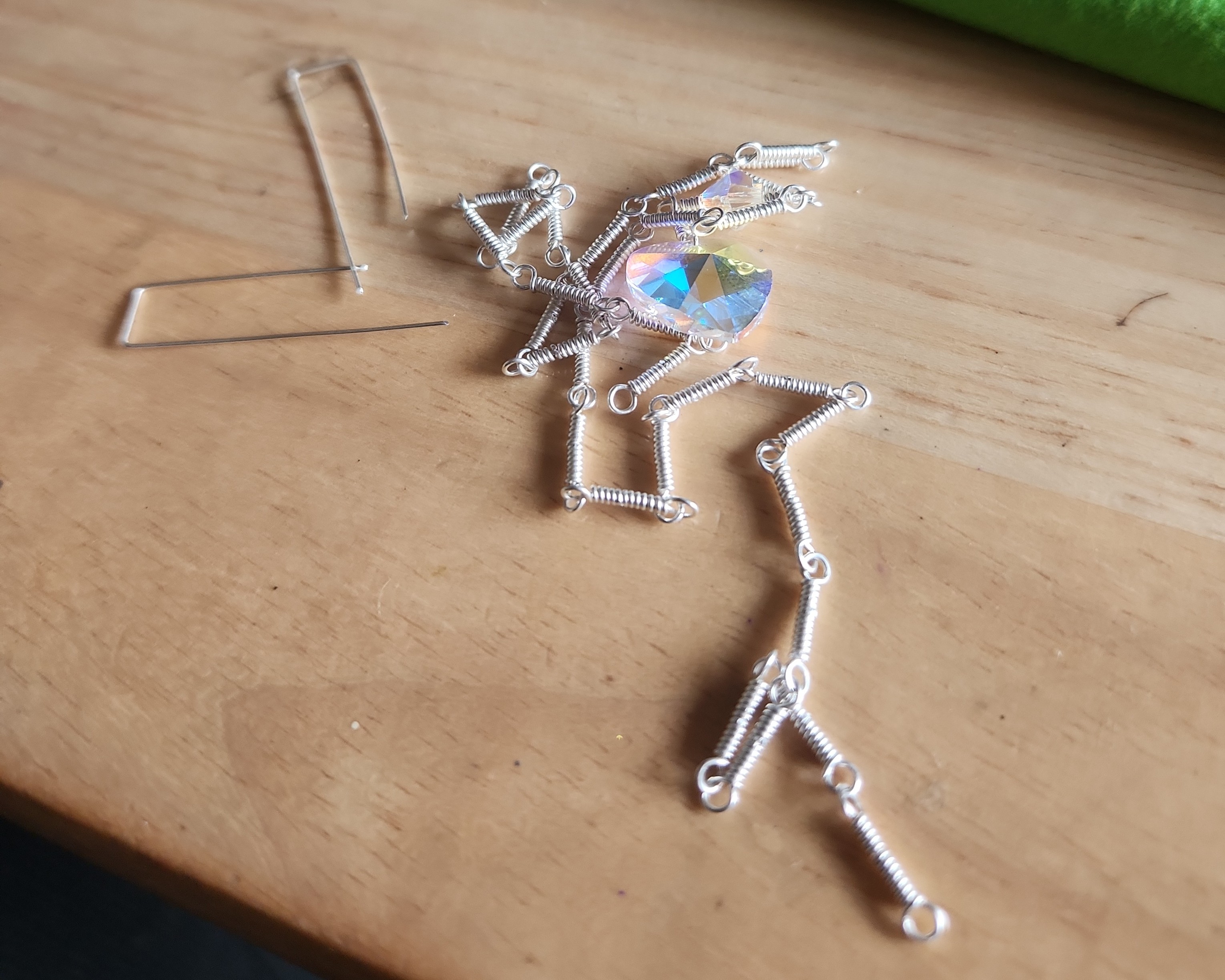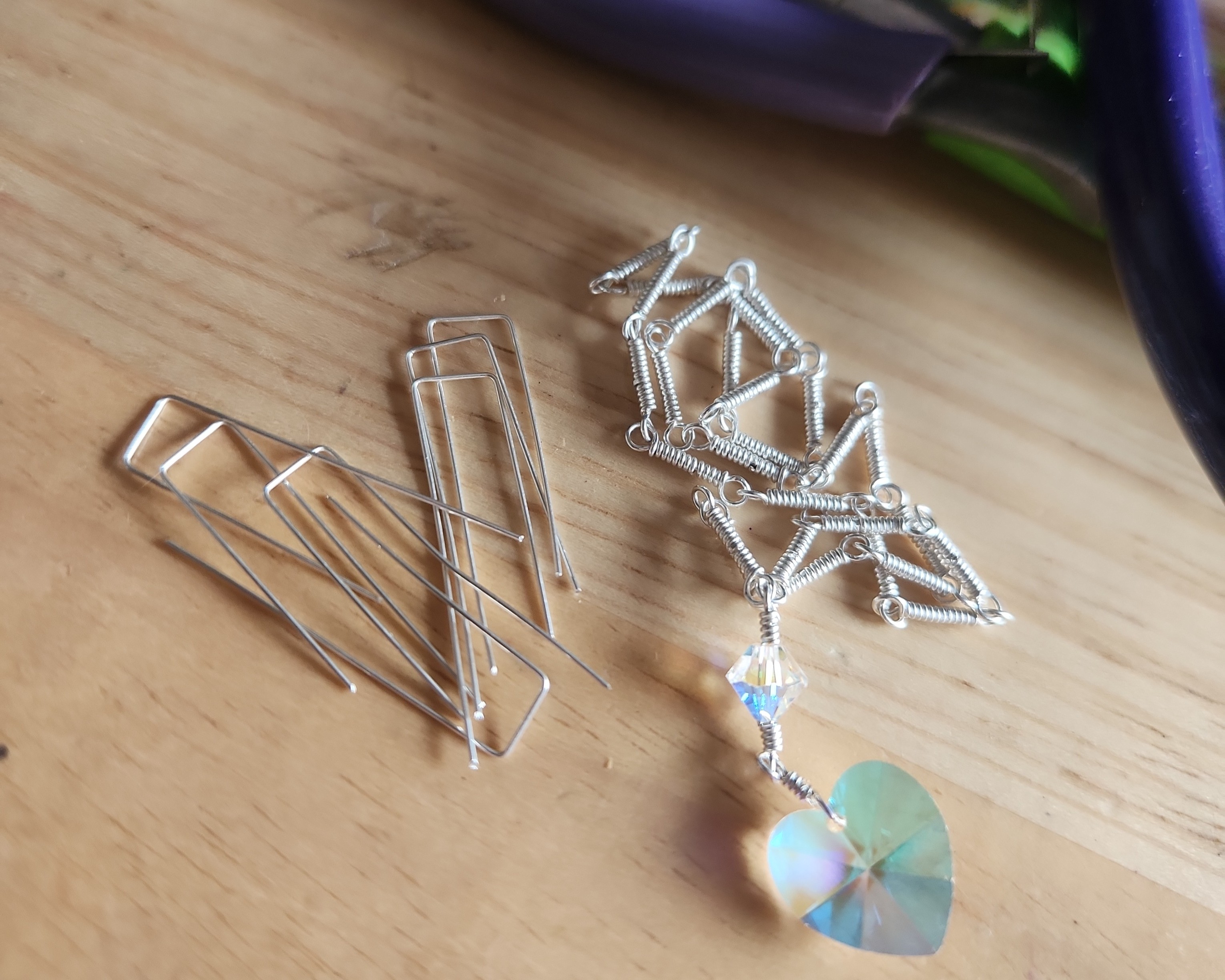 This necklace was crafted with Sterling Silver wires, and upcycled, vintage aroura borealis glass crystal beads in bicone and heart shapes.
